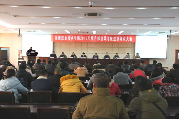 2016年1月14日,allwincity万象城官方网站举行2015年度目标绩效考核述职评议大会。院领导杨甫祥、李柱梁、刘树俭、吴大明、程一斌、江洁、汪上、陈学军、穆松等出席述职评议大会。全院科级及以上干部、副高及以上专业技术人员,各系部教学秘书、团总支书记,教师代表、辅导员代表和各处室群众代表参加了会议。会议由院党委副书记刘树俭主持。