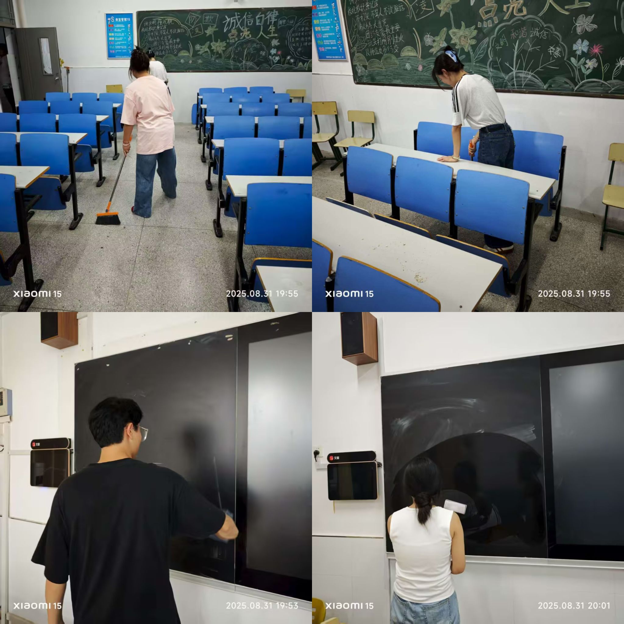 2025年8月31日,管理学院学生会组织在校学生志愿者,于学院所属教室内开展 “洁净校园,喜迎新生” 开学卫生大清扫。