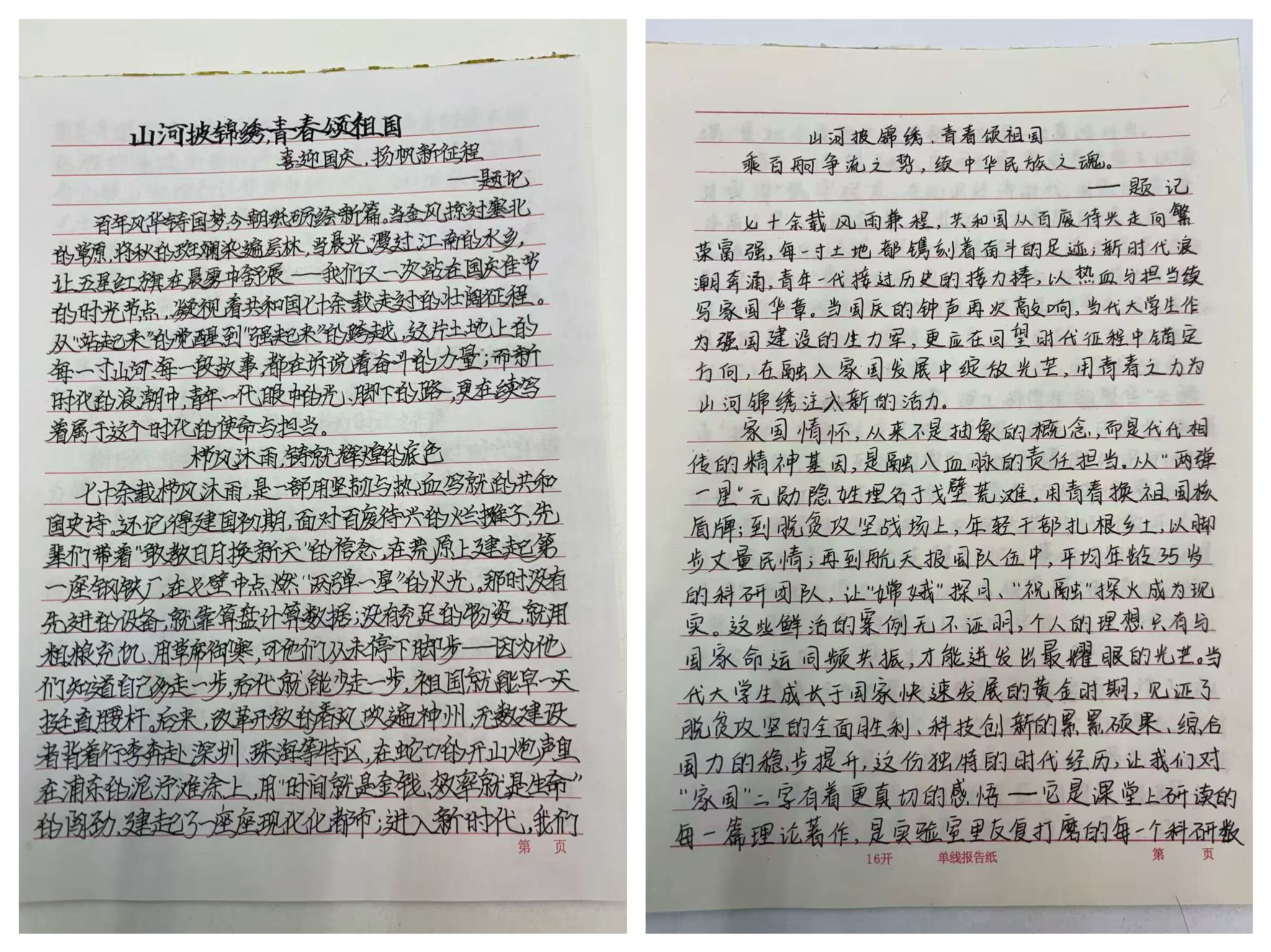 活动期间,同学们紧扣主题踊跃投稿,以笔为媒抒发情怀、以文为志传递信念。部分作品回望历史,深情感悟共和国建设发展的伟大成就;部分作品立足当下,深入思考新时代青年的使命责任;部分作品展望未来,清晰阐述个人成长与家园振兴的结合路径。各类征文情感真挚、立意深刻,蕴含着当代大学生对祖国的赤诚热爱,展现出昂扬向上、奋发有为的精神风貌。