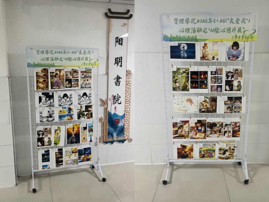 目前,活动期间征集的优秀AI漫画作品,已在13号楼一站式社区阳明书院照片墙展出,以直观展示形式延伸活动影响力,让“自我接纳、情绪治愈”的理念通过画面传递给更多师生,持续传达自我关怀的心理能量。