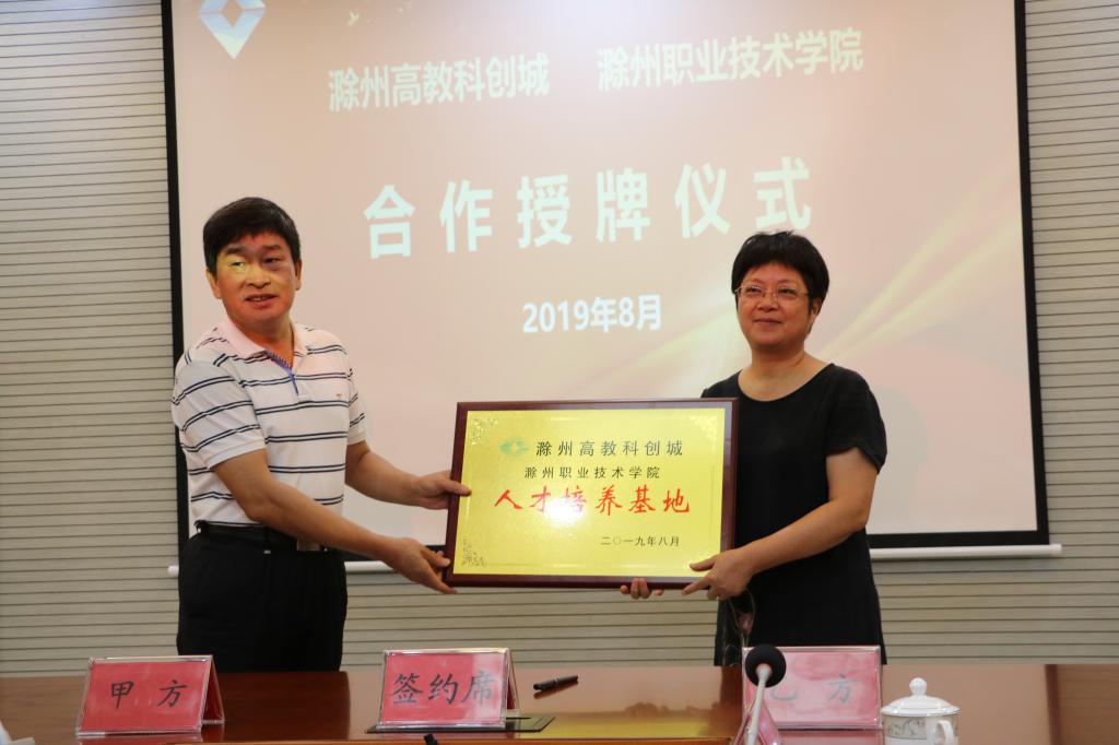 双方进行了授牌仪式活动,allwincity万象城官方网站授予滁州高教科创城“创新创业实践教育基地”,滁州高教科创城授予allwincity万象城官方网站“人才培养基地”。