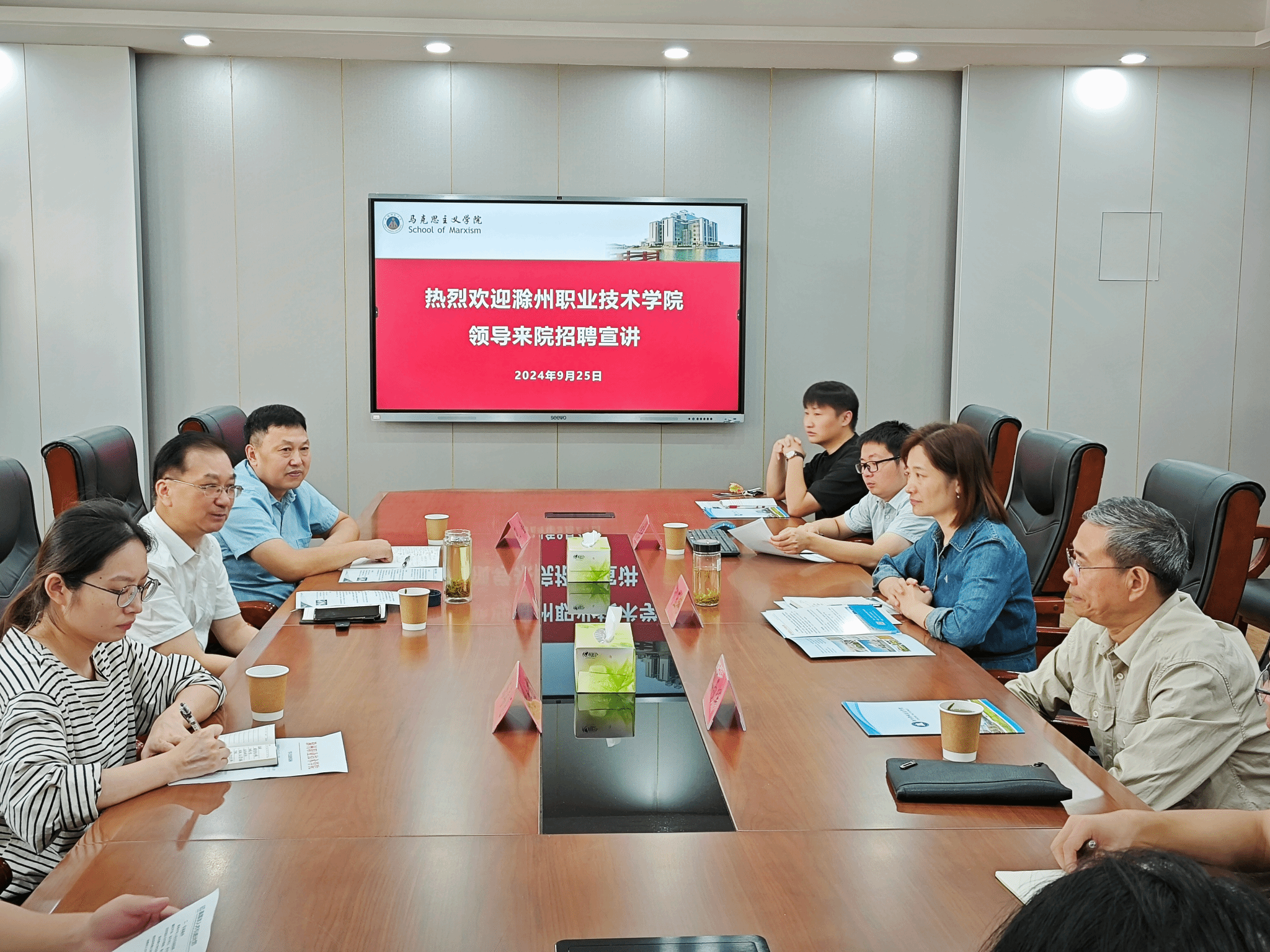 为加强万象城官网马克思主义学院建设和提升思政课教师队伍整体实力,推动马院工作固本强基、提质创优,9月25日,校党委委员、宣传统战部部长王冬带队赴安徽师范大学开展人才引进和重点马院建设考察交流,马克思主义学院党总支书记、院长孔金陪同参加考察座谈等活动。