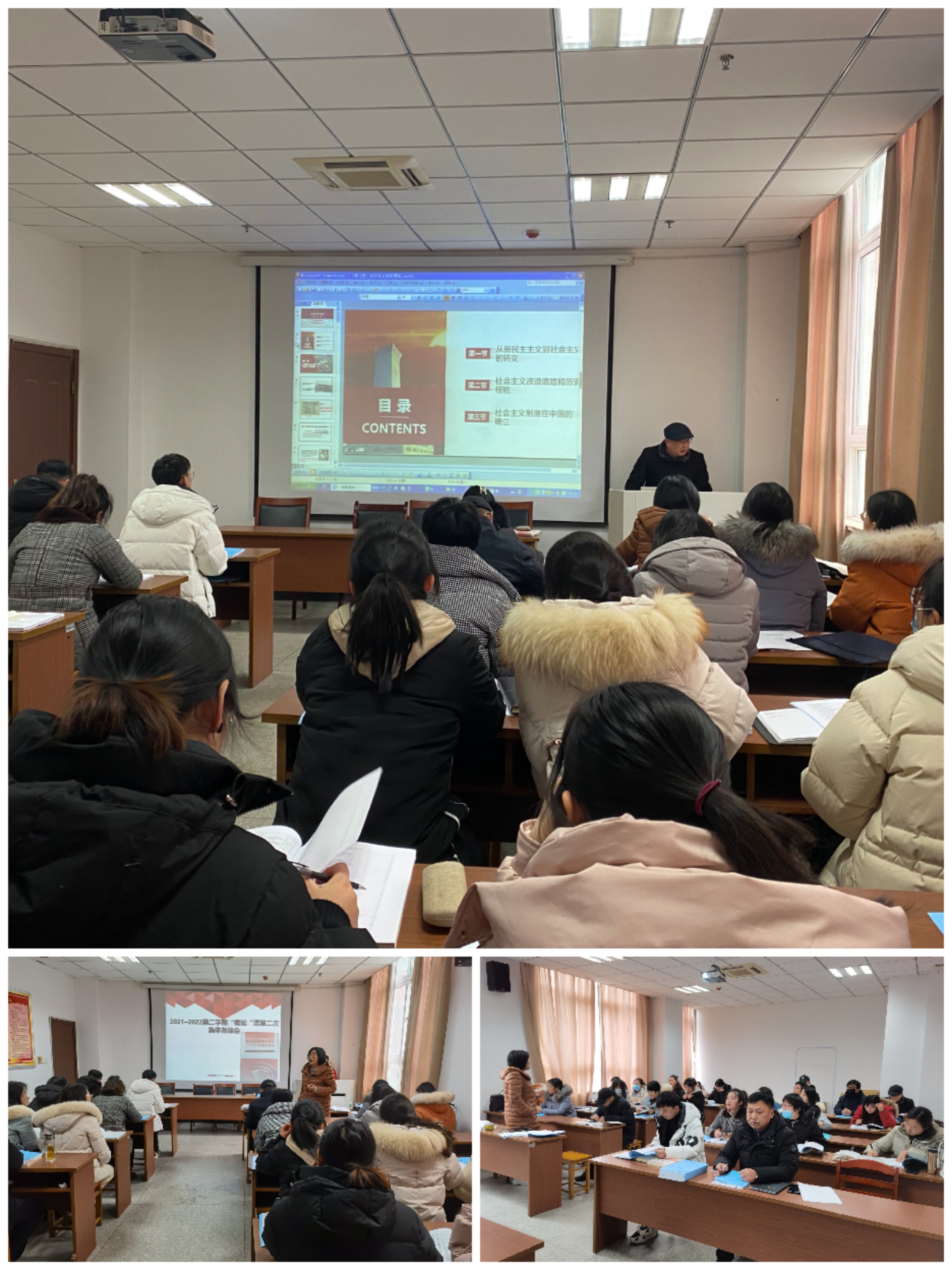 备课会上,按照假期任务部署,教研室主任张家莉就2021版新教材章节变化、导论“马克思主义中国化的历史进程与理论成果”及第一章“毛泽东思想”章节内容及教材逻辑结构、学习通APP线上使用、教学思路以及教学案例的引用做了详细的阐述;汪立超、焦春才、吴佳佳等三位老师先后就课程“新民主主义革命理论”、“社会主义改造理论”、“社会主义建设道路初步探索的理论成果”三个专题的教学目标、教学内容、教学重难点、教学方法等进行了充分地讨论和交流。会上,向任课教师分发了寒假期间老师们分章节备课撰写的胶印教案。