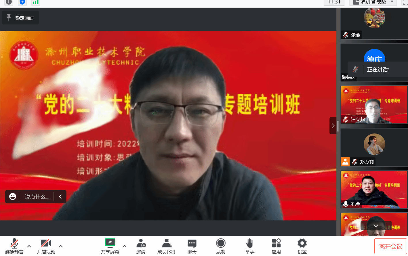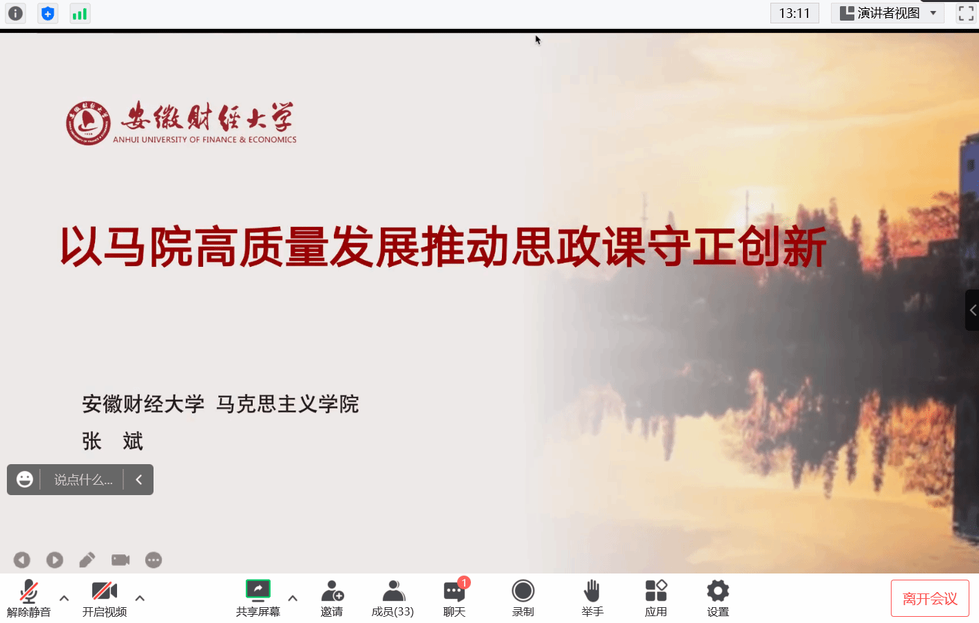 allwincity万象城官方网站习近平新时代中国特色社会主义思想和党的二十大精神进教材专题培训班正在有序的进行中,12月27日,安徽财经大学马克思主义学院院长、教授张斌受邀做第三场专题辅导以马院高质量发展推动思政课守正创新》,线上会议由马克思主义学院副院长孔金主持,全体专兼职思政教师参加。