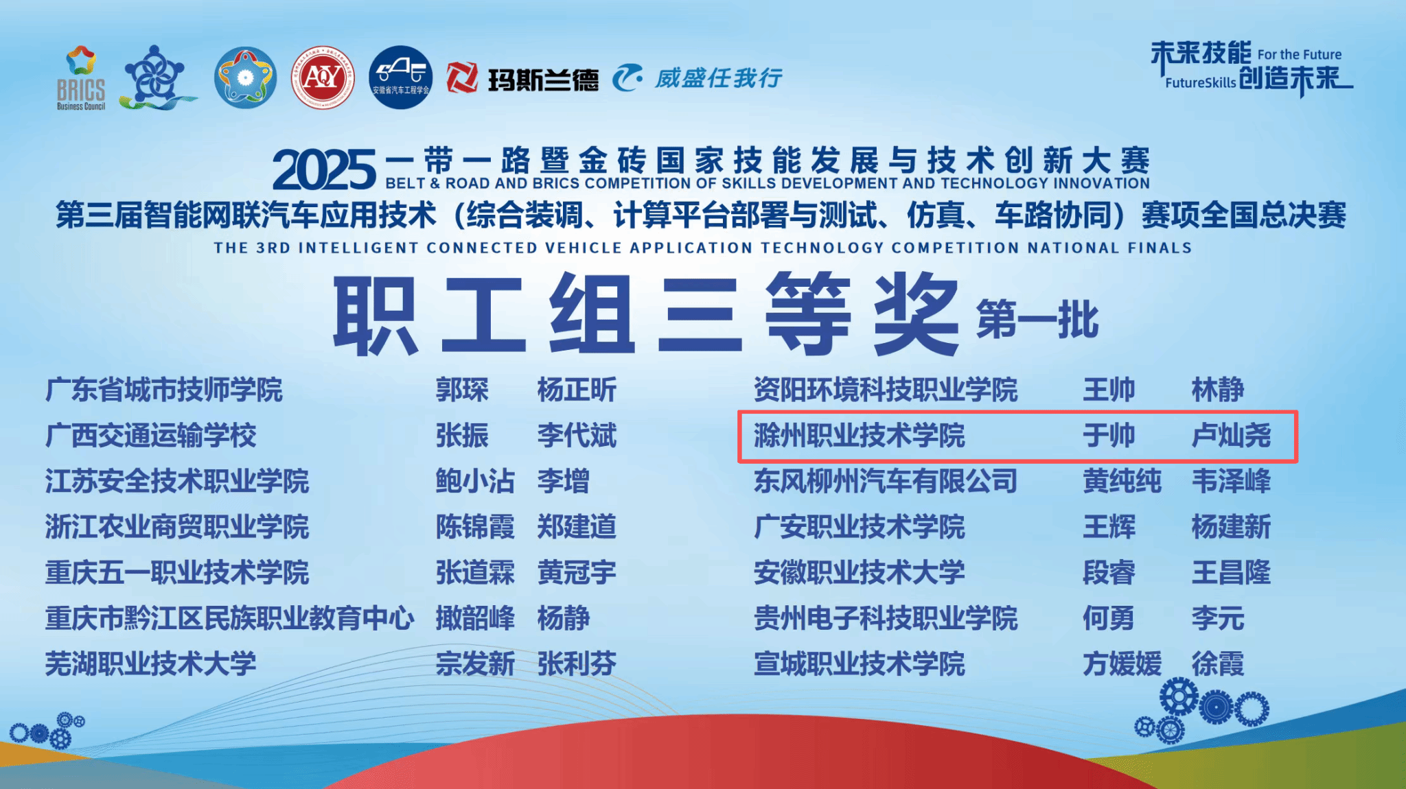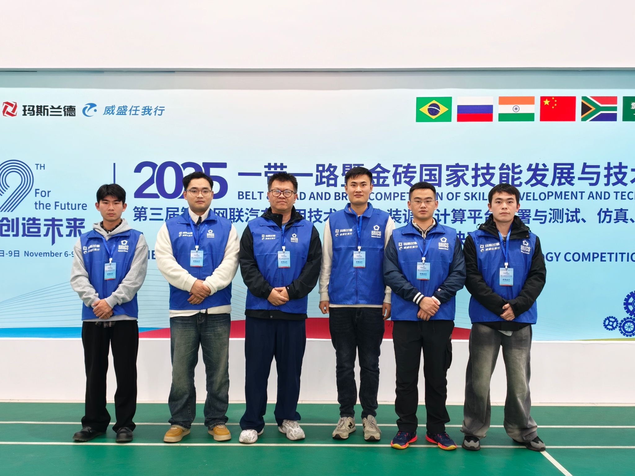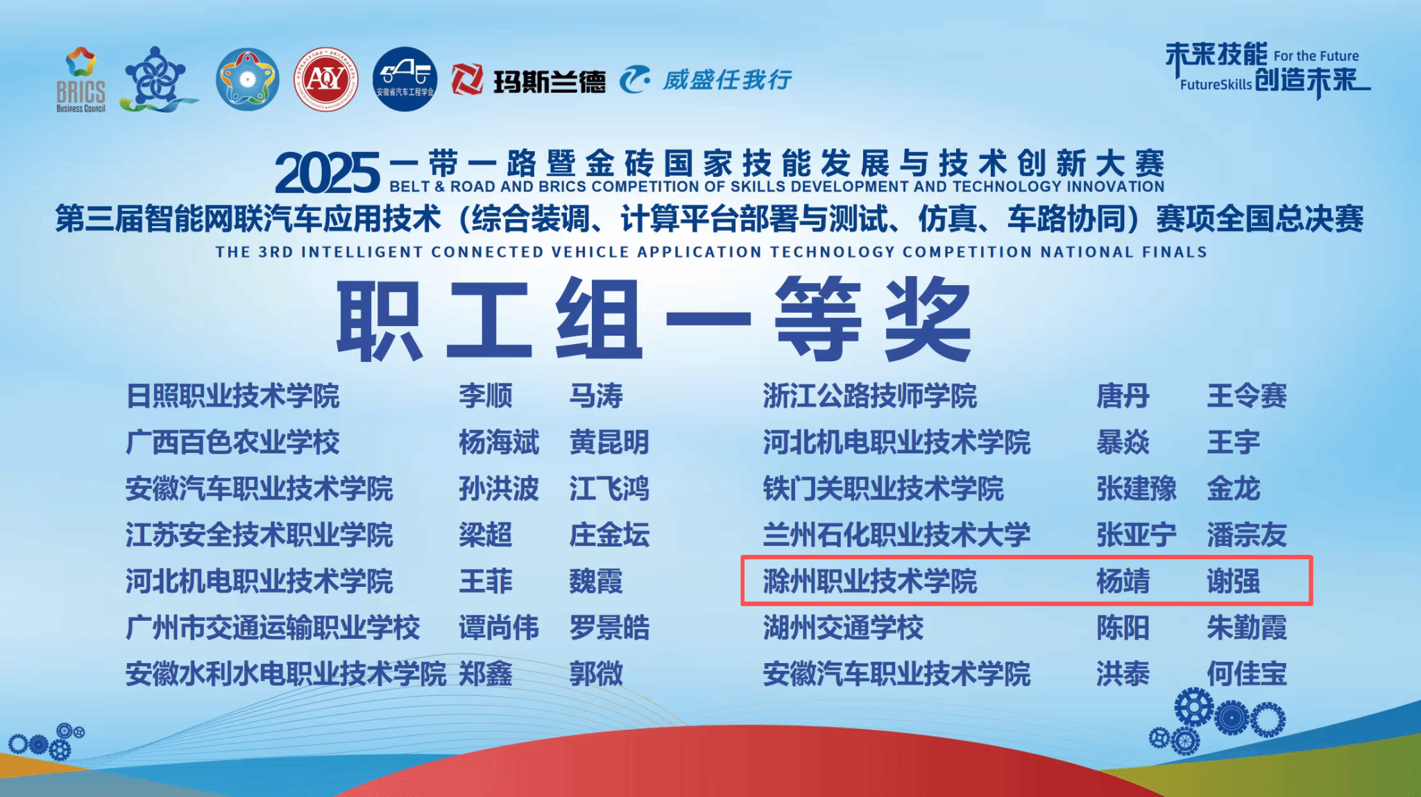 2025年11月7日,2025“一带一路”暨金砖国家技能发展与技术创新大赛第三届智能网联汽车应用技术(综合装调、计算平台部署与测试、仿真、车路协同)赛项全国总决赛在安徽汽车职业技术学院隆重开幕。万象城官网机械与汽车工程学院四名教师与两名学生在赛场同台竞技,在全国290支队伍、580名选手的激烈角逐中脱颖而出,其中职工组杨靖、谢强老师获得一等奖,于帅、卢灿尧老师获得三等奖,学生组在杨章林老师的指导下获得二等奖的好成绩。