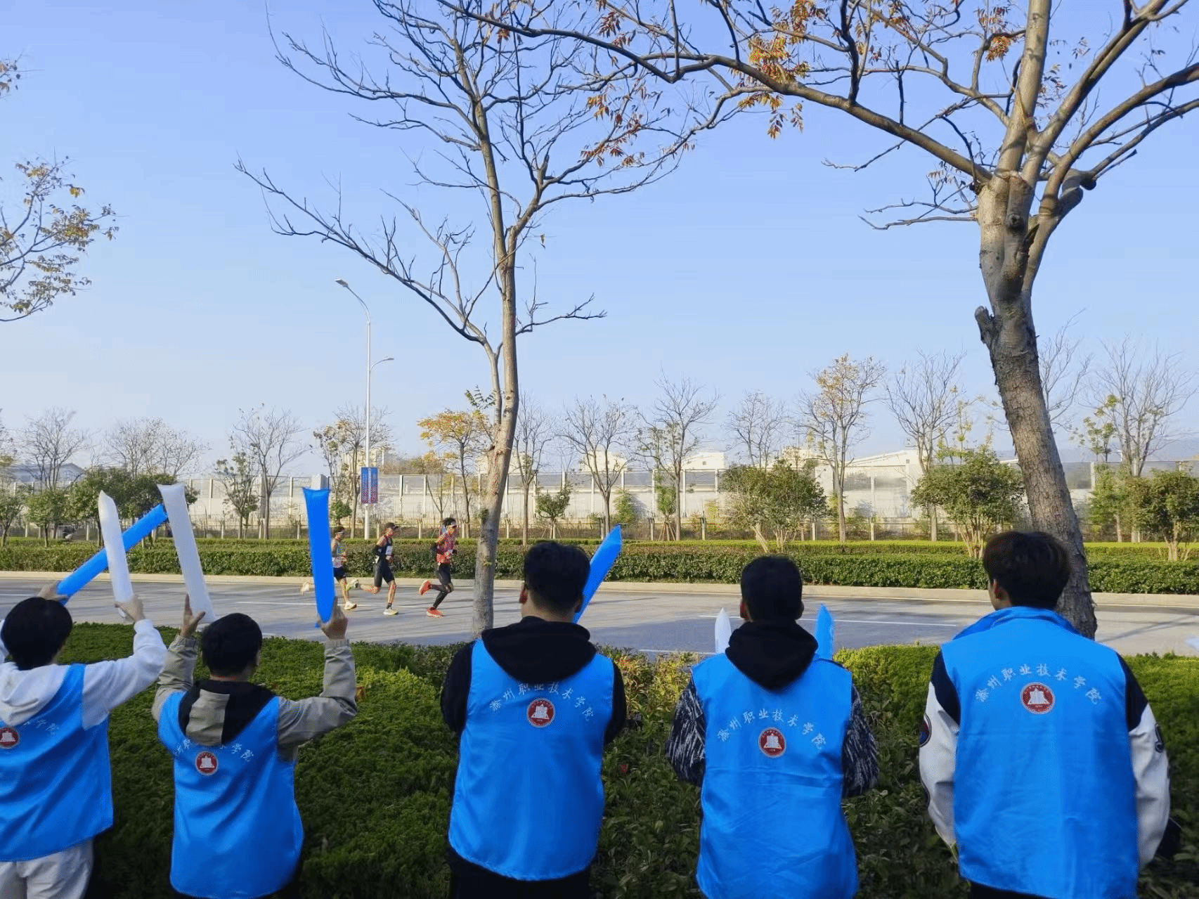 赛事开始前,学院精心组织选拔,队员们提前开展排练,身着统一服装,手持彩旗与加油牌,在指定赛段形成靓丽风景线。赛道上,他们整齐挥舞道具,高喊 “滁马加油,奔跑不止” 的口号,用激昂呐喊和活力姿态,为每一位途经选手注入前进动力,选手们挥手回应,现场氛围热烈。