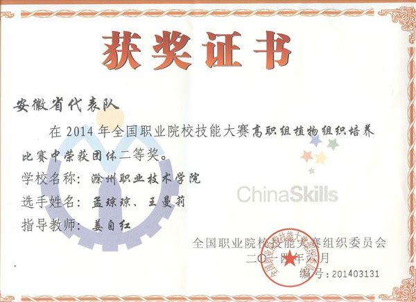 2014年全国职业院校农林类技能大赛“植物组织培养”项目于6月15日在江苏农林职业技术学院进行。来自全国各地60支代表队共120名选手参加了高职组“植物组织培养”的母液配制、培养基配制、无菌转接的三个环节比赛。在院领导、教务处及各部门大力支持和配合下,食品系领导精细谋划,指导教师团队姜自红、涂清芳、贾雪晴三位老师耗费了大量的时间和精力,带领参赛学生勤学苦练,最终2012级园艺技术班孟琼琼和王曼莉两同学以规范的现场操作、娴熟的专业技能、稳定的心理素质喜获此次比赛二等奖,为我院和安徽省代表队赢得了荣誉。