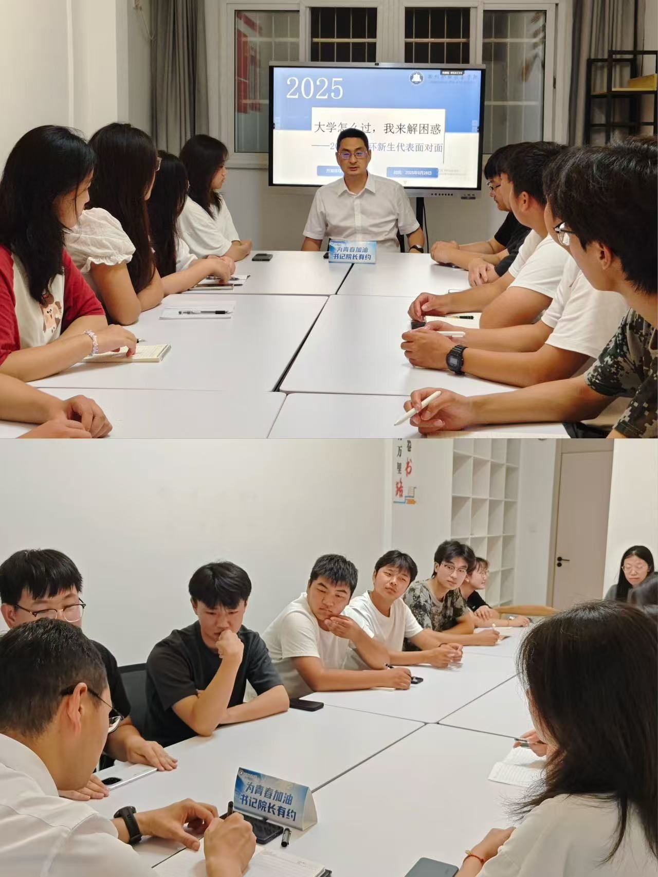 为帮助2025级新生更快适应大学生活,明确未来规划,9月28日晚,食品与环境工程学院“书记院长有约”暨“我与院领导面对面”交流活动在“丰乐驿站”举行。副院长孟飞教授以“大学怎么过 我来解困惑”为主题与新生代表面对面交流,围绕学业规划、职业发展、校园生活等方面为新生答疑,共话成长。