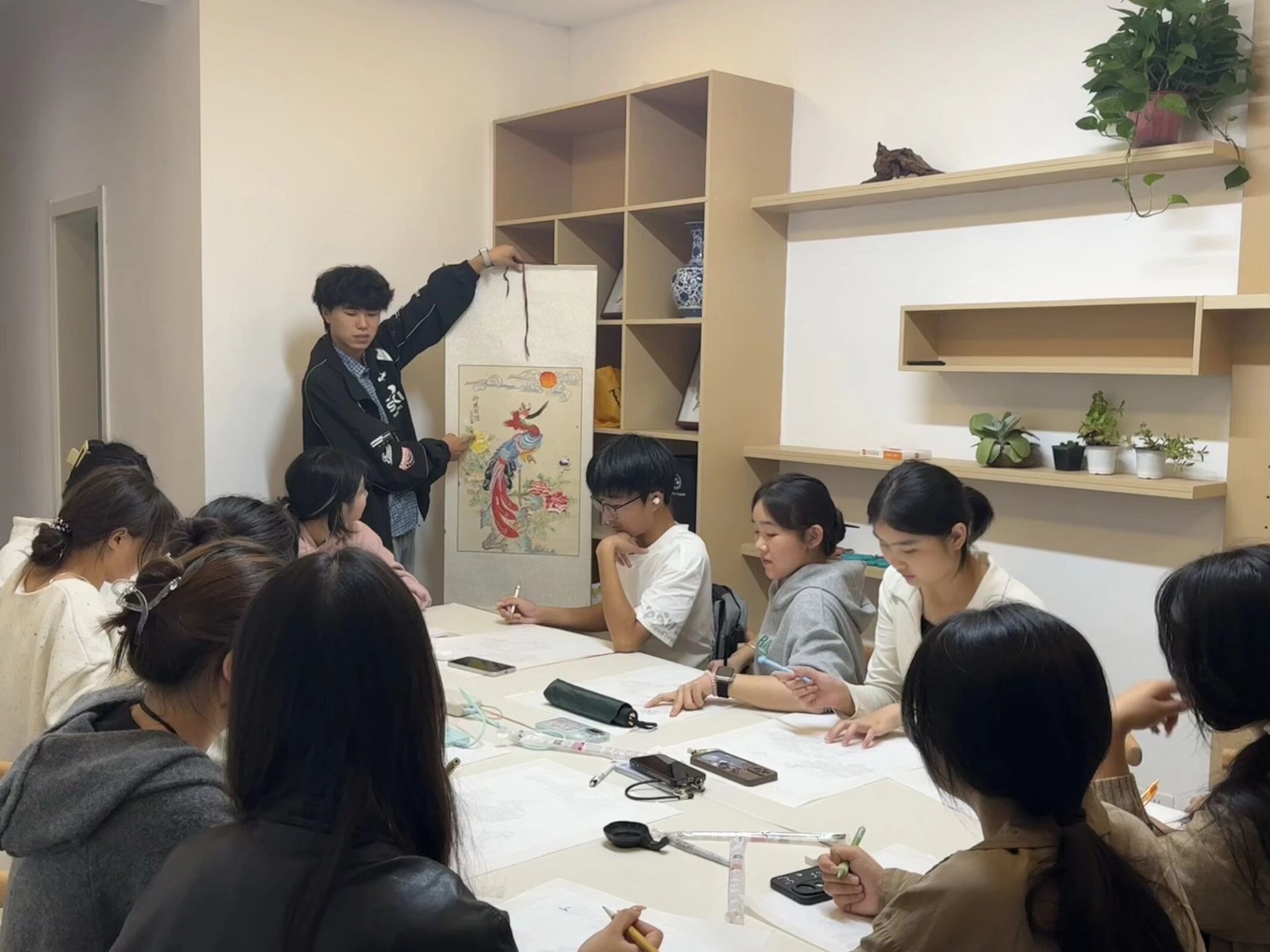 “凤画发源于安徽凤阳,至今已有六百余年历史,是省级非物质文化遗产,其特别之处在于,凤凰的造型不是随意创作,而是严格遵循‘蛇头、龟背、鹰嘴、鹤腿、如意冠、九尾十八翅’的固定程式……”活动伊始,负责人邓全龙以自己的凤画作品为实物进行详细讲解,介绍了凤画的历史渊源、艺术特点、构图技巧、色彩搭配及绘制步骤,从勾勒凤鸟轮廓的“起笔要稳”,到填充色彩的“浓淡相宜”,让参加活动的同学能快速掌握凤画创作的核心要点。