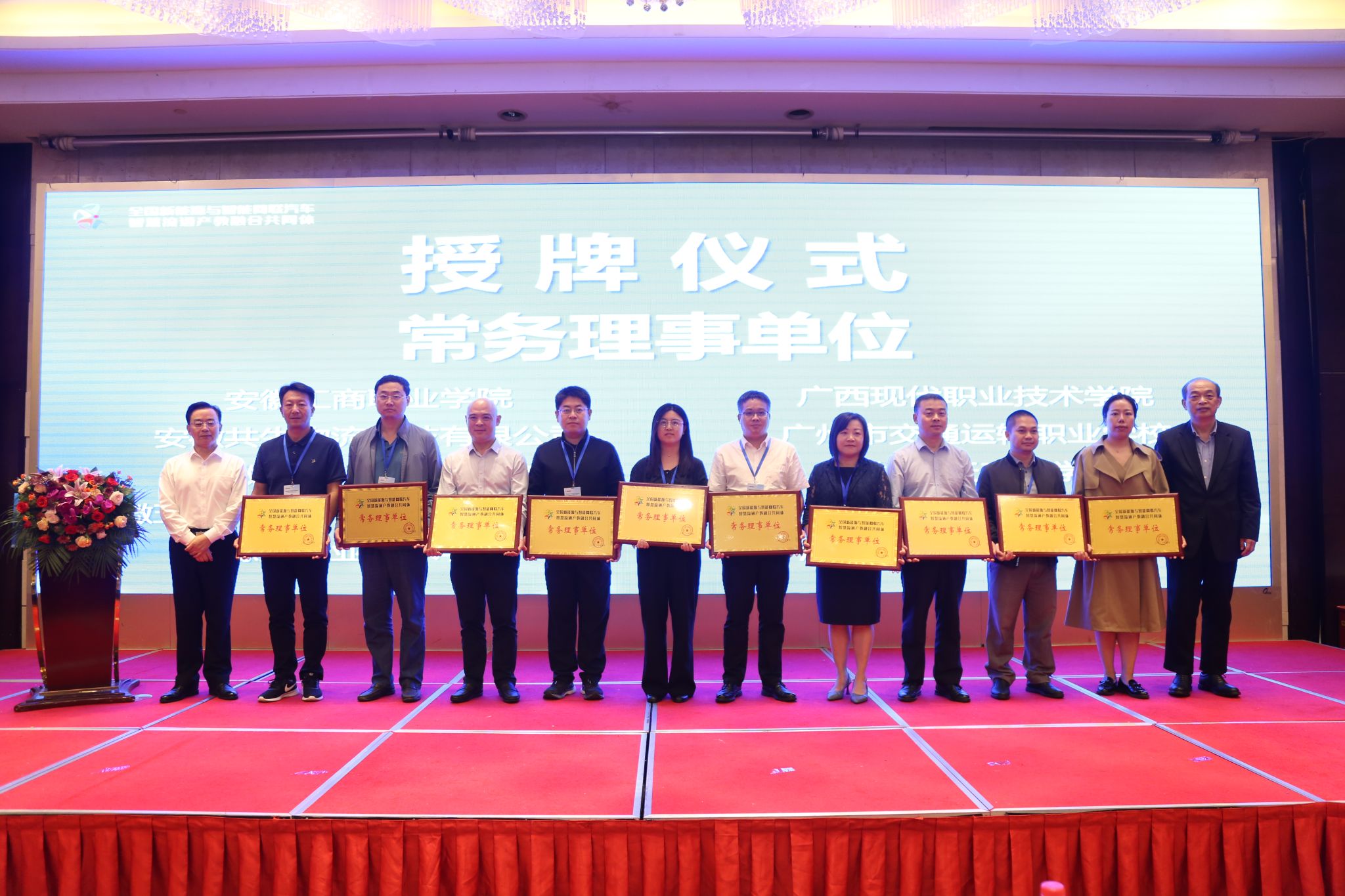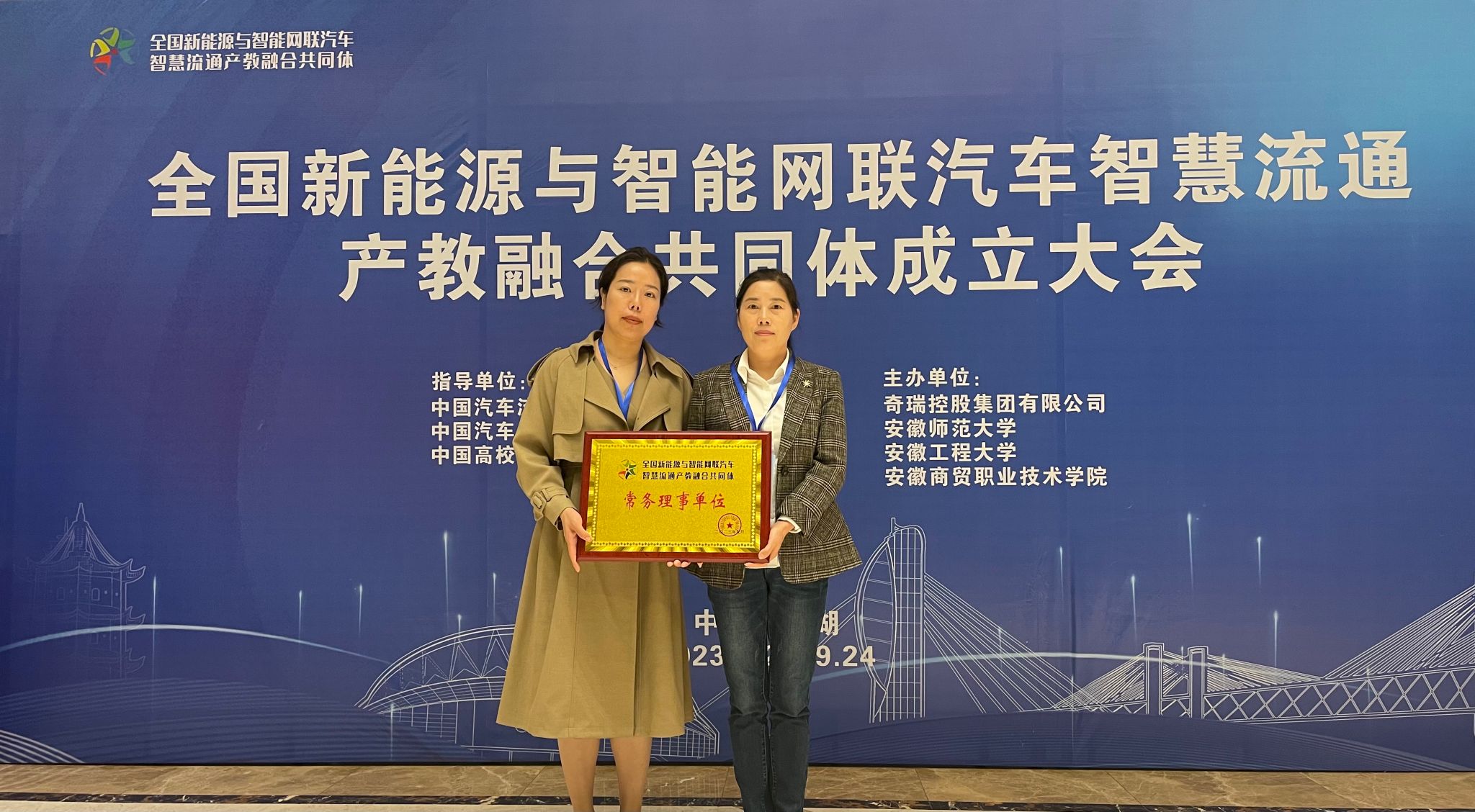 商学院赵荣和曹洁两位教师代表学校数字营销教学团队受邀参加共同体启功仪式。安徽省教育厅高等教育处二级调研员檀俊,芜湖市人民政府副秘书长孙万胜,安徽师范大学党委常委、副校长高峰,安徽工程大学党委常委、副校长凤权,奇瑞控股集团有限公司奇瑞大学执行校长、中国汽车工业协会职业技能分会副会长李康,安徽共生物流科技有限公司董事长卢立新、奇瑞盈丰投资人力运营总监尹杰、中国高校校办产业协会产教融合分会副会长曾黎明,全国职业院校教育类专业教指委副主任李忠,共计94所本科院校、高职院校以及行业企业近200名代表参加会议。共同体启动现场,全体参会代表审议并表决通过了《全国新能源与智能网联汽车智慧流通产教融合共同体章程(草案)》,表决通过第一届理事会组成人员名单。在热烈的掌声中,共同体正式启动,与会领导为共同体成员单位集中授牌,万象城官网被授予全国新能源与智能网联汽车智慧流通产教融合共同体常务理事单位。