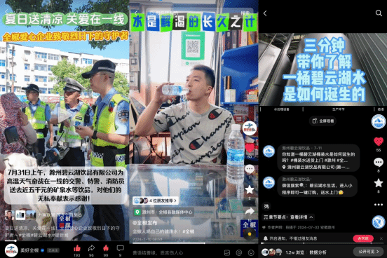 在企业实践期间,教师深入生产一线,全面了解了饮品生产、销售、管理等各个环节,积极参与企业的日常运营和项目管理,以快速消费品的营销策划为目标,以产品特点与优势宣传为载体,重点学习了新技术、新设备在生产、制造、运输、品质方面的保障。通过学习,教师对企业的生产方式、工艺流程、产业发展趋势等有了系统认识,并以此为基础进行品牌宣传与推广等活动。帮助企业运营碧云湖饮品官方抖音账号、视频号;参与策划了生产、服务、公益活动等环节的数字化营销推广,其中以“夏日送清凉,关爱在一线”为主题的公益活动获得了全椒县广播电视台、美好全椒的官方报道;实践期间,企业自营账号数字化推广累计展现量达10万+,取得了良好的数字化推广效益。