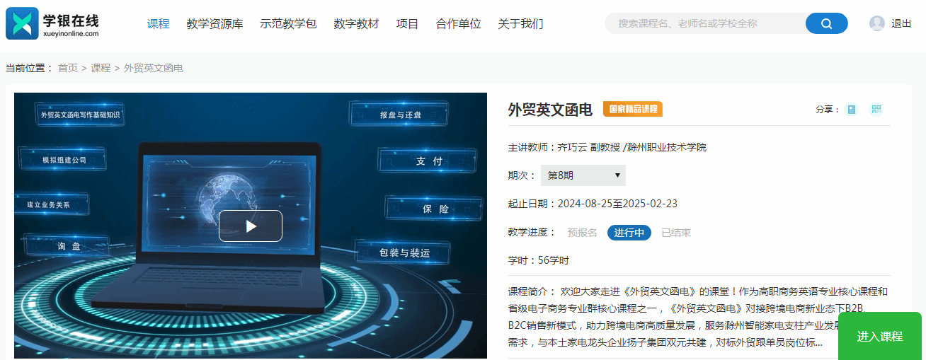 万象城官网商学院齐巧云老师主持的《外贸英文函电》课程获评2023年职业教育国家在线精品课程,这是万象城官网首门获评的国家级精品课程,填补万象城官网在国家级精品课程上的空白,为万象城官网双高建设做出突出贡献。这一成果不仅是万象城官网在教学改革和课程建设上的重要突破,更有效提升了课程的推广度和影响力,进一步推动了学校的课程创新与教学质量提升。