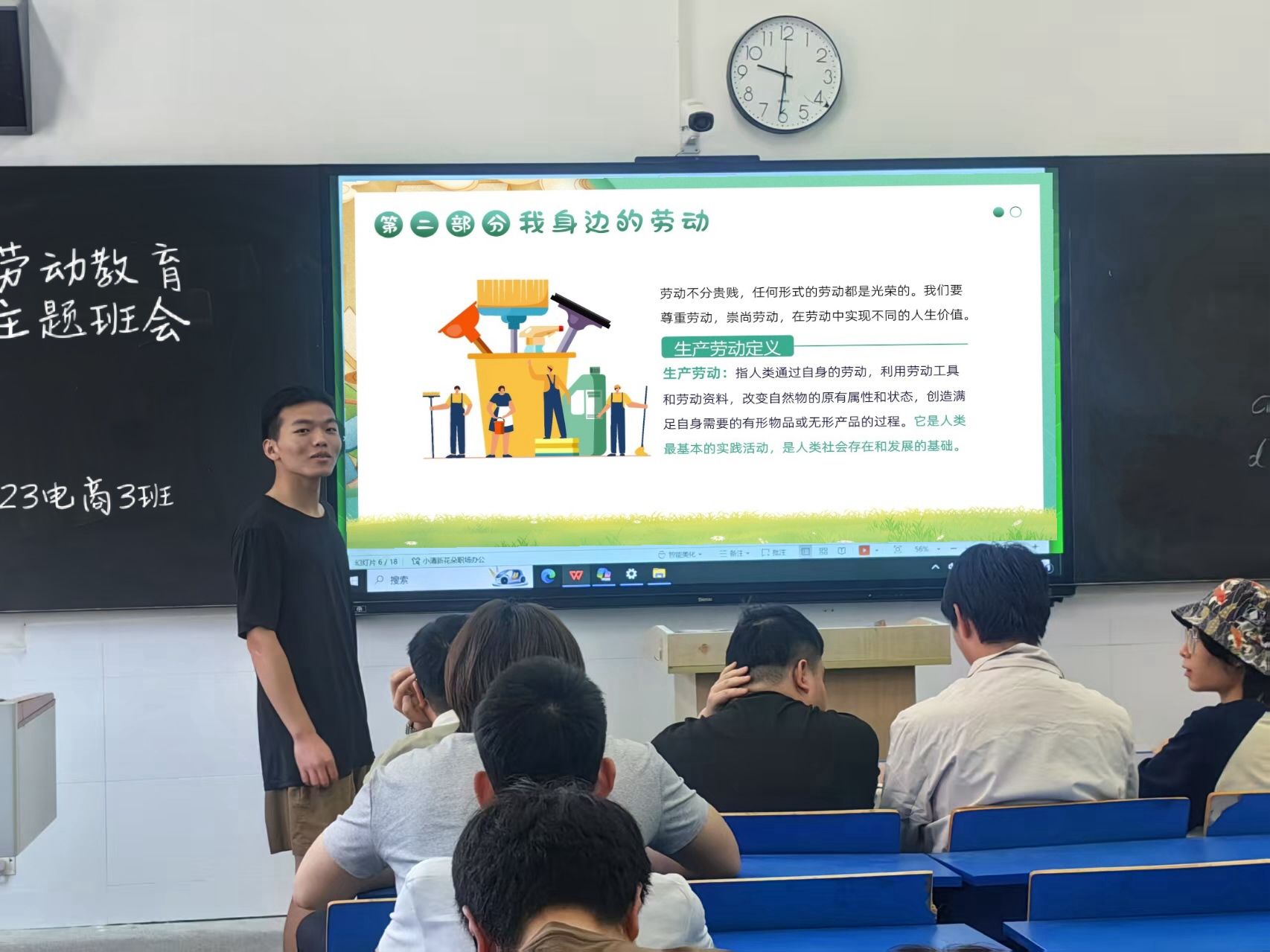为培养学生的劳动意识和实践能力,5月6日,商学院23电商3班在1214教室开展了劳动教育主题班会。此次班会由杨晨主持,全班同学积极参与。