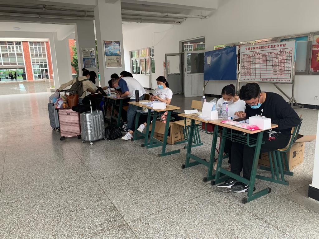 由于疫情的影响,在经历了漫长的寒假后,5月14日,商学院迎来了大二返校学生。当日上午18级各班辅导员在致真楼大厅设置接待点,迎接返校学生。学生到达学校后,需要携带返校承诺书、学生个人旅程轨迹信息和新冠肺炎疫情防控学生档案三项文件,由辅导员审核通过后,开具报到单并测量体温、领取口罩,有序进入宿舍。各班级辅导员对返校前的学生都完成了健康状况摸底,包括返校方式、出发及到达时间等信息,精细化记录各类事项,确保学生信息全程可追踪。截至当天晚上十一时,377名大二学生安全顺利返校。