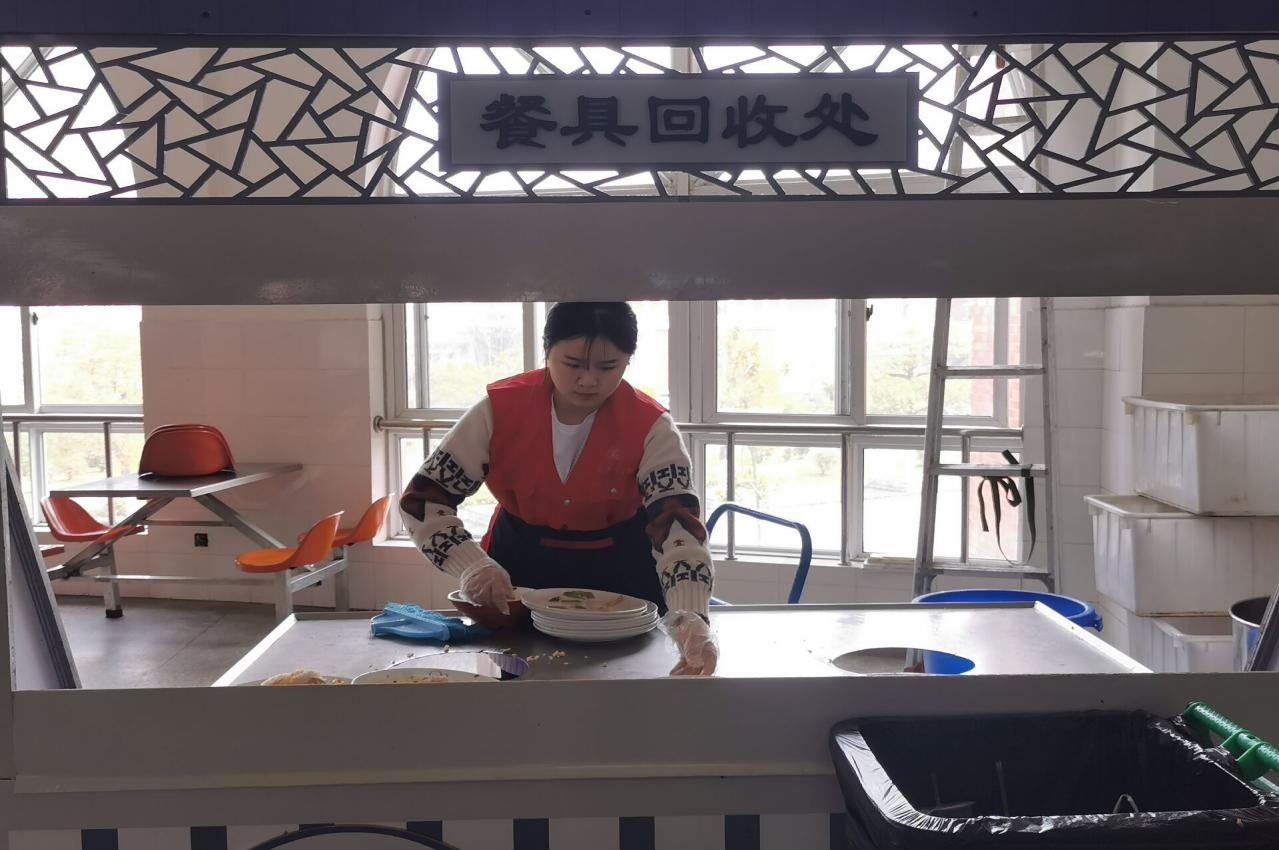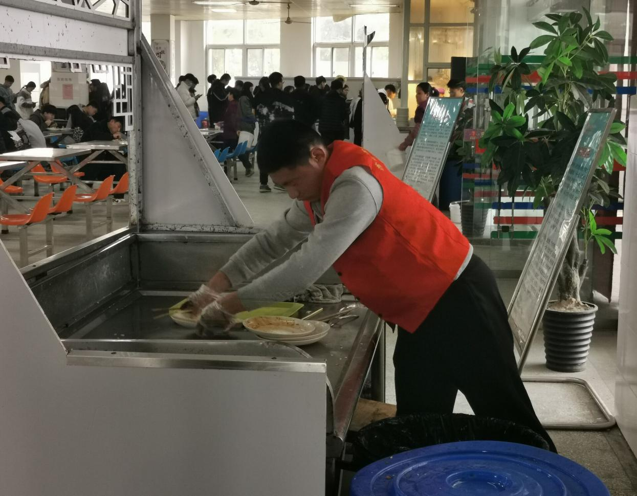 由于食堂有3层,每层有两个收拾餐盘的摊位,总共安排了6位班级同学,另外还有两位负责拍照的同学。为了让同学们手上收拾餐盘粘上的油污容易清洗,事先准备了一次性手套发给大家。我自己也是参与者之一,食堂到了饭点的时候人真的很多人山人海。我们收拾餐盘也需要下“功夫”,为了不让餐盘堆满桌子,我们快速收拾餐盘。可谓是无心遐想,只能一丝不苟做自己分内的事。