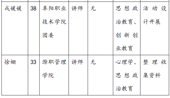 成员戎媛媛为阜阳职业技术学院辅导员,在就业创业指导方面成绩突出,2017年指导学生分别获“昆山花桥杯”第十二届安徽省大学生职业规划设计大赛暨大学生创业大赛“安徽省大学生职业规划之星(金奖)”和“安徽省大学生创客之星(银奖)”,2018年指导学生获 第四届“互联网+”大赛红色之旅赛道省级铜奖。