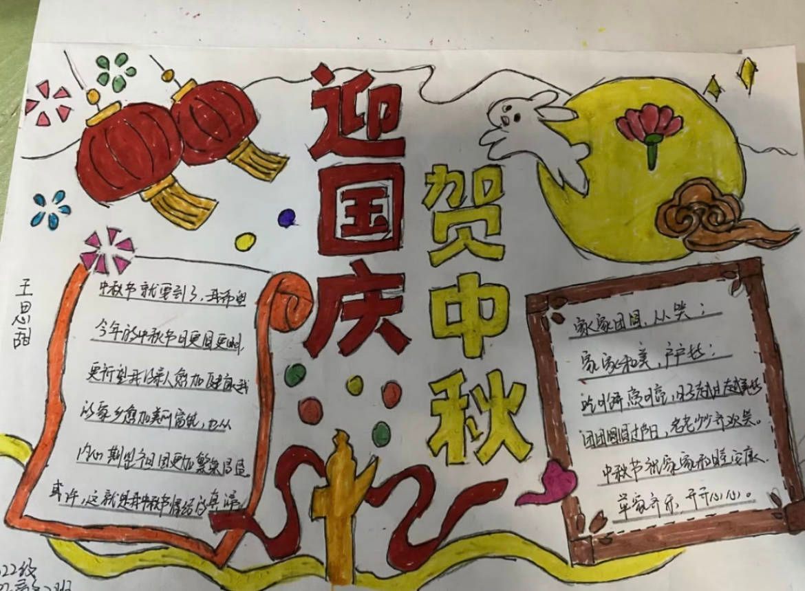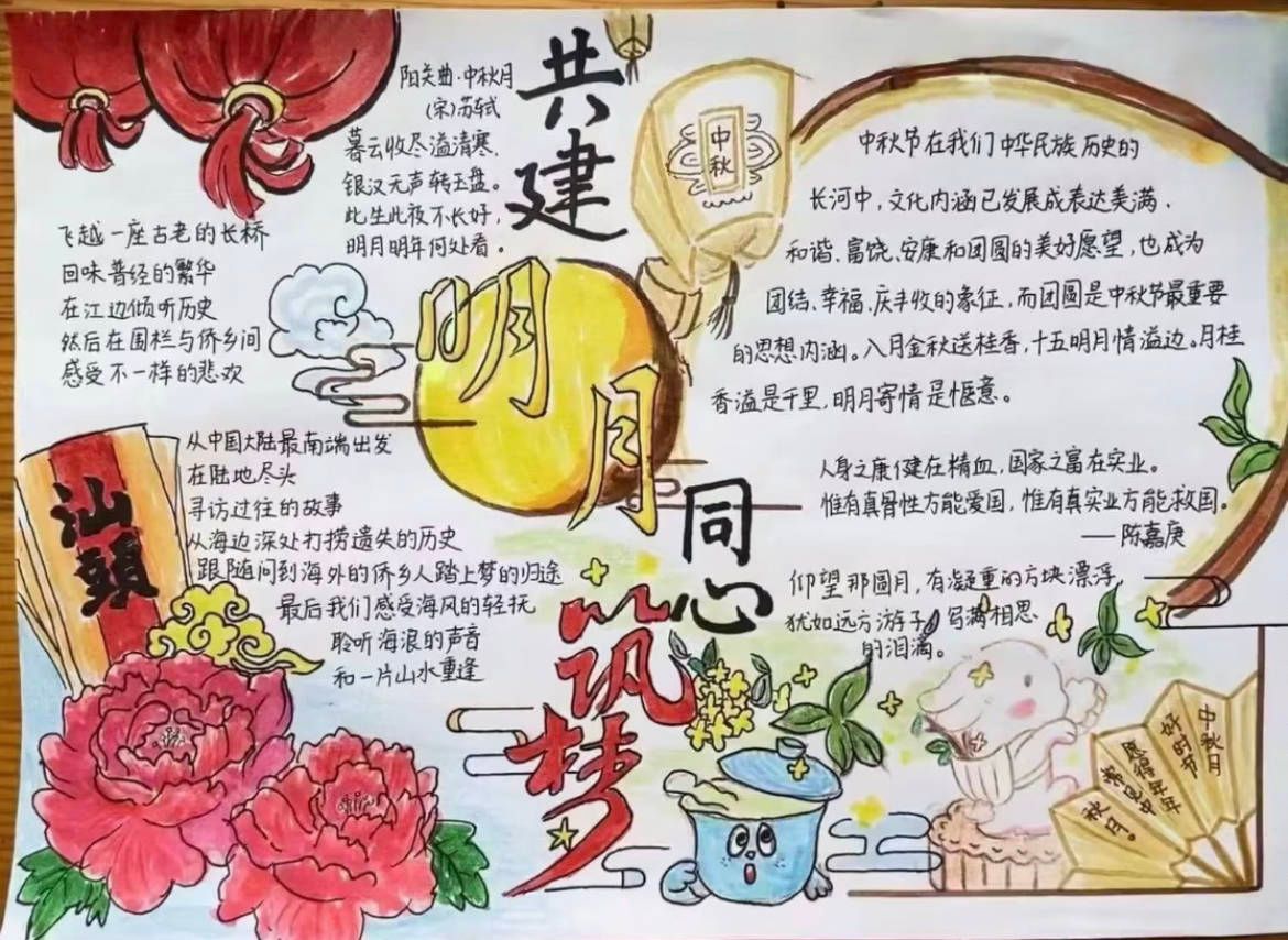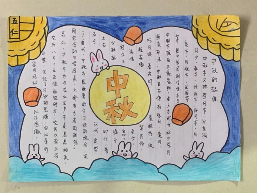 同学们利用假期时间,搜集庆祝中秋佳节相关资料,精心设计,用手中的画笔和缤纷的线条绘制出一幅幅构思巧妙、版式独特、色彩绚烂的手抄报。大家手抄报版面设计主题明确、活泼新颖、色彩鲜明、内容丰富,展现了同学们对中华传统文化的认同感和自豪感。