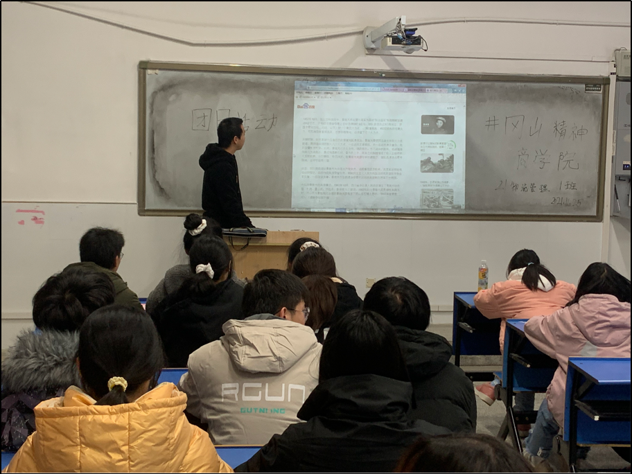 活动首先由班长王靖威对班会的流程及秩序先进行了简单介绍。随后,通过播放励志短片向同学们展现井冈山精神的历史形成、基本内涵与内在学习价值。同时用PPT展示的方式向同学们介绍了黄继光的英雄事迹,黄继光用胸膛抵住喷火枪口,用生命直面冰冷死亡,一身硬骨头满腔赤诚血,21岁的黄继光活着是一面旗帜,倒下是一座丰碑,通过了解英雄不怕牺牲的精神进一步增强同学们的思想政治觉悟和爱国主义精神。团支书张志超表示:“我们要向革命先烈表示崇高的敬意,要永远怀念他们、牢记他们,传承好他们的红色基因,不畏艰苦,发扬光大。”