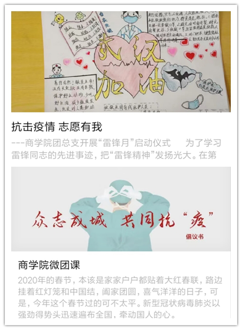 截至目前,商学院团总支推送有关疫情防控文章20余篇,班级qq群推送文章10余篇。接下来,商学院团总支将继续按照坚定信心、同舟共济、科学防治、精准施策的要求,全力以赴做好疫情防控宣传工作。