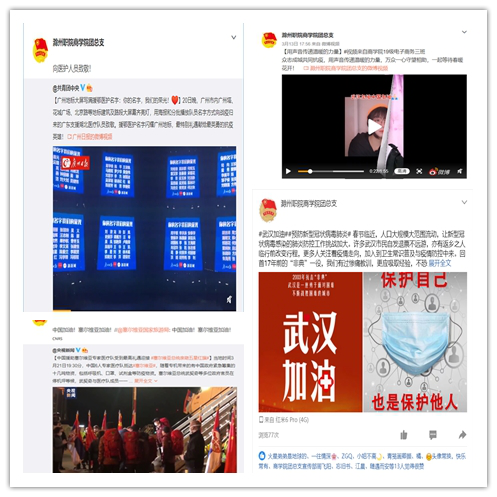 商学院团总支紧密配合学院的工作,做好宣传动员,积极利用新媒体宣传防控知识,通过学校和学院各级新媒体平台、班级QQ群、微信群等,及时向学生推送新冠肺炎防护知识和抗击疫情期间注意事项,教育学生正确做好自我防护,引导学生做好居家防疫,不聚集、不外出;同时教育学生提升法治意识,不造谣、不信谣、不传谣,坚定信心,众志成城,共克难关。