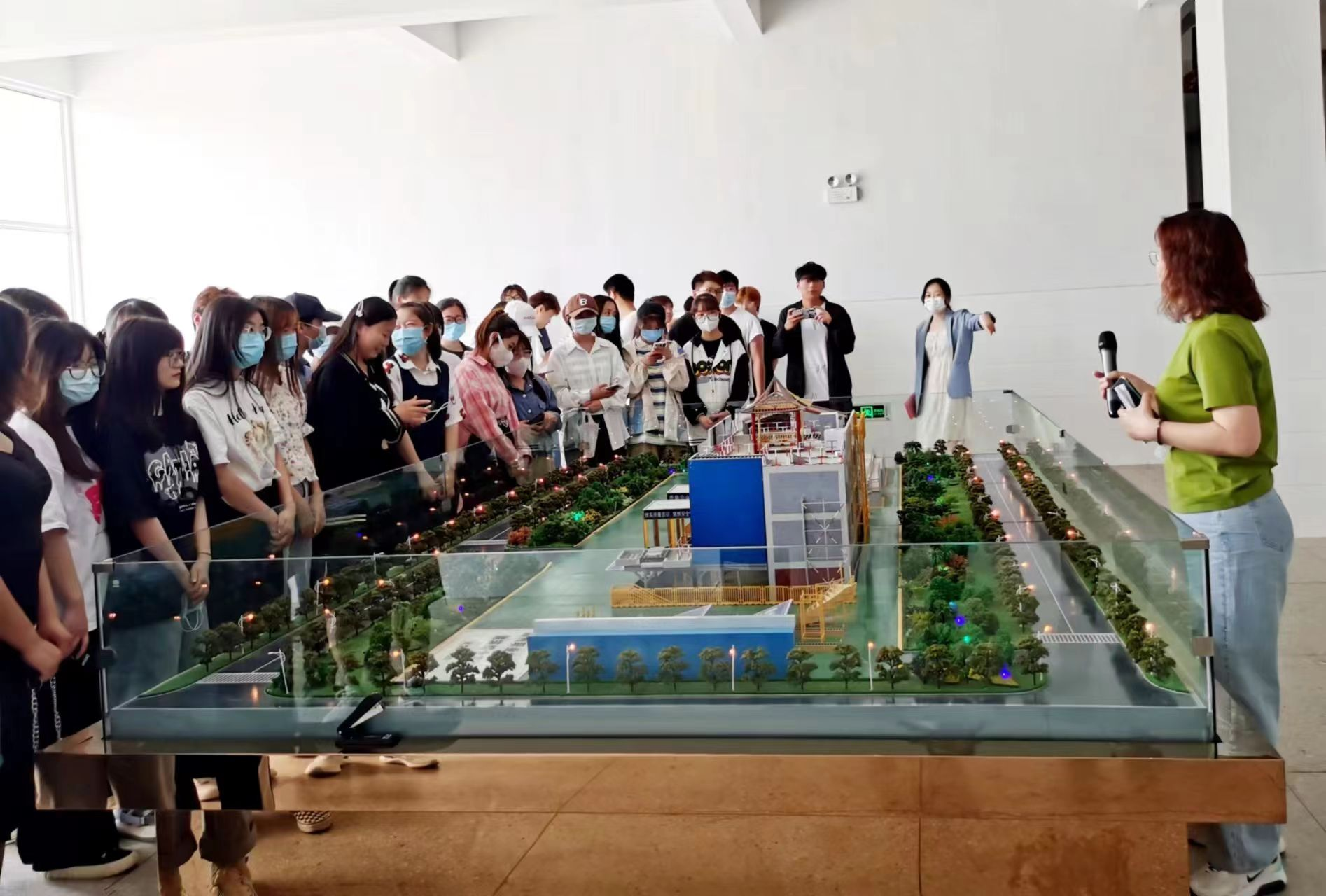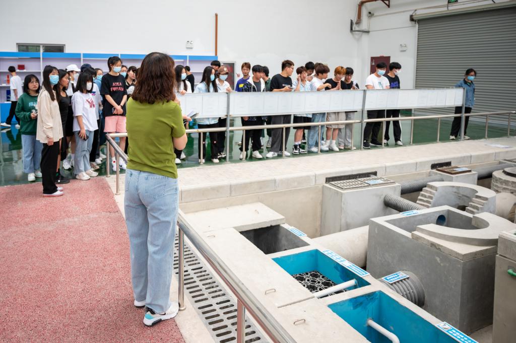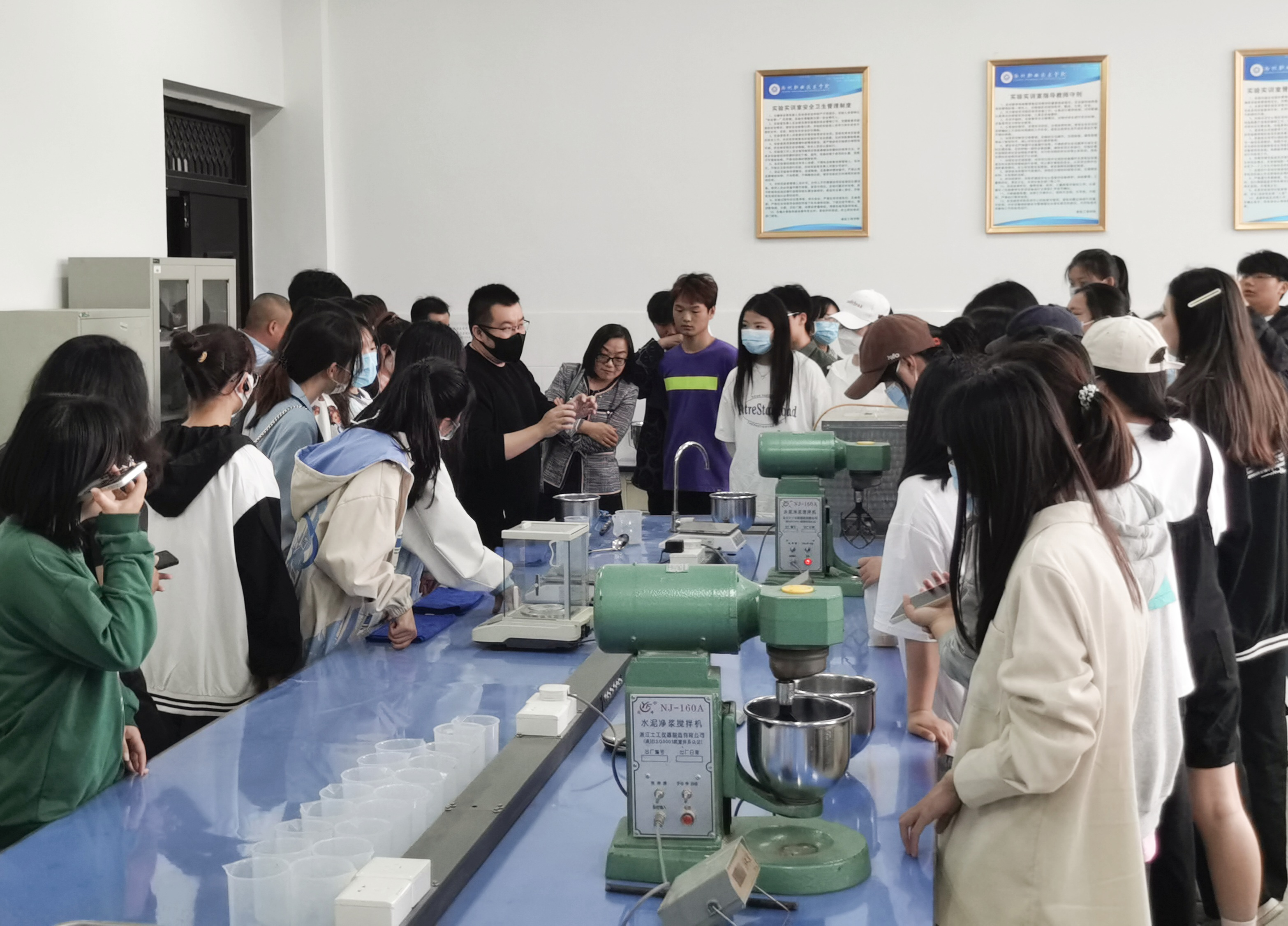 在实训馆科普教育基地开放参观阶段,商学院商务英语专业的同学们跟随梁成燕老师进入实训馆参观学习。第一个进入的展区是工法楼,梁成燕老师围绕工法楼的结构及建筑施工工艺技术、建筑仿真以及“1+X”BIM实训等向学生们进行讲解;第二个展区是PTS操作区,梁成燕老师现场指导学生操作钢筋绑固,带动同学们的学习积极性以及动手操作能力;第三个展区是砂石胶凝材料实训室,葛易老师现场拌制水泥净浆,带领同学们直观感受水泥标准稠度用水量的制作过程;之后同学们跟随建工学院实训中心主任李玉荣观摩建筑实训馆各个实训室。科普馆学习观摩活动中,同学们兴趣盎然,对各类建筑设备和工艺充满好奇,认真聆听讲解老师的介绍,并纷纷拿出手机拍照。
