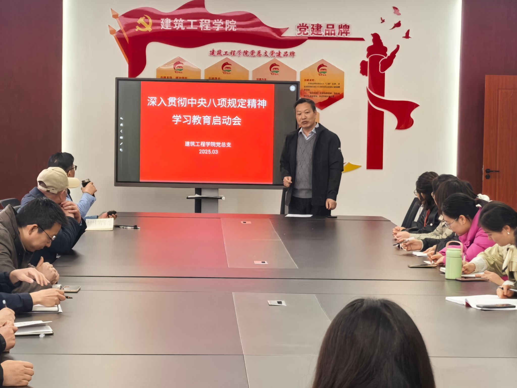 为进一步加强党风廉政建设,推动深入贯彻中央八项规定精神学习教育走深走实,提升党员干部的纪律意识和作风素养,3月28日,建筑工程学院组织全体教师党员开展了深入贯彻中央八项规定精神学习教育启动会。此次活动旨在通过全面、系统的学习,使全体党员深刻领会中央八项规定精神实质,切实将其融入到日常工作与生活中。