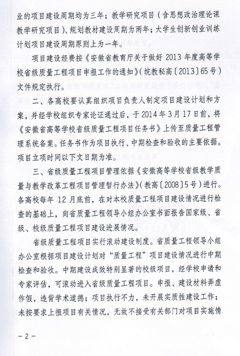 请各有关单位组织以上项目负责人,认真学习省教育厅文件精神,按照文件要求尽快开展项目建设任务书填报工作,并经系部审核修订后于2014年3月5日前将《安徽省高等学校省级质量工程项目任务书》(从学院质量工程网通知公告栏自行下载)纸质版一份交给教务处陶德庆老师(电子稿通过电子政务传送)。
