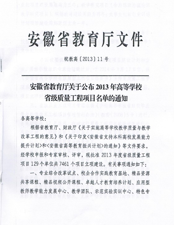 2013年安徽省高等学校省级质量工程项目名单已经公布,万象城官网获批省级专业综合改革试点、特色专业、精品资源共享课程、校企合作实践教育基地、卓越人才教育培养计划、示范实验实训中心、教学团队、教学研究项目、教学成果奖、教学名师、教坛新秀等11个类别26项。现将省教育厅《关于公布2013年高等学校省级质量工程项目名单的通知》(皖教高〔2013〕11号)予以转发,并就有关事项通知如下: