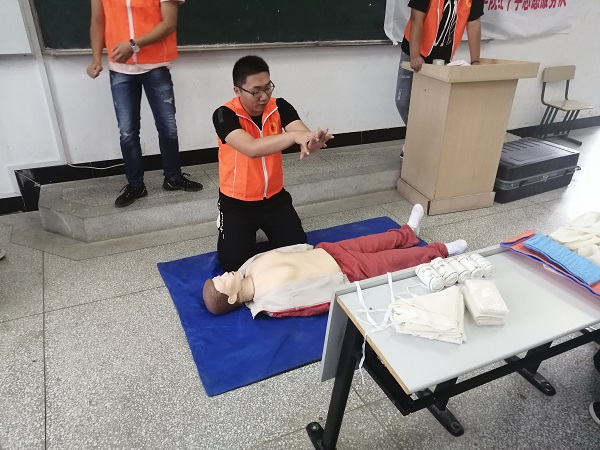 院红十字会会员向大家讲解了心肺复苏、创伤救护、排除气道异物等基本知识,并现场进行了实际操作方面的培训。同学们学习的热情很高,边听边练,增强了自我保护和救助他人的能力。