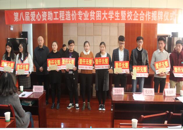 第8届爱心助学捐赠活动,在市造价协会的倡议组织下,安徽佳诚工程咨询有限公司、滁州中联水泥(混凝土)有限公司等19家企业慷慨解囊,捐赠40000元,共资助了40名工程造价专业大学生.据悉,2009年,市建委、市造价协会提出了以培养造价专业技术人才队伍为保障,推动工程造价咨询企业做大做强的工作思路,与我院签订了共建校外实习与就业基地协议,联合开展爱心助学捐赠和建立校外实习与就业基地活动。本项活动开展以来,共有382名大学生受到资助,累计资助金额46.83万元。