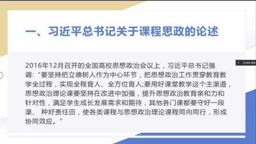 工程造价专业负责人管红兵老师以承担的《工程招投标与合同管理》课程为例,深刻阐述了课程思政建设的意义、作用以及党支部在推进课程思政建设中的作用;支部书记闫秀芳老师以《建筑工程计量与计价》课程为例,针对45分钟的课堂教学,梳理挖掘了课程中潜在的思政元素,直观展示了课程思政资源的挖掘过程,为专业课教师的课程思政建设提供了参考和依据。