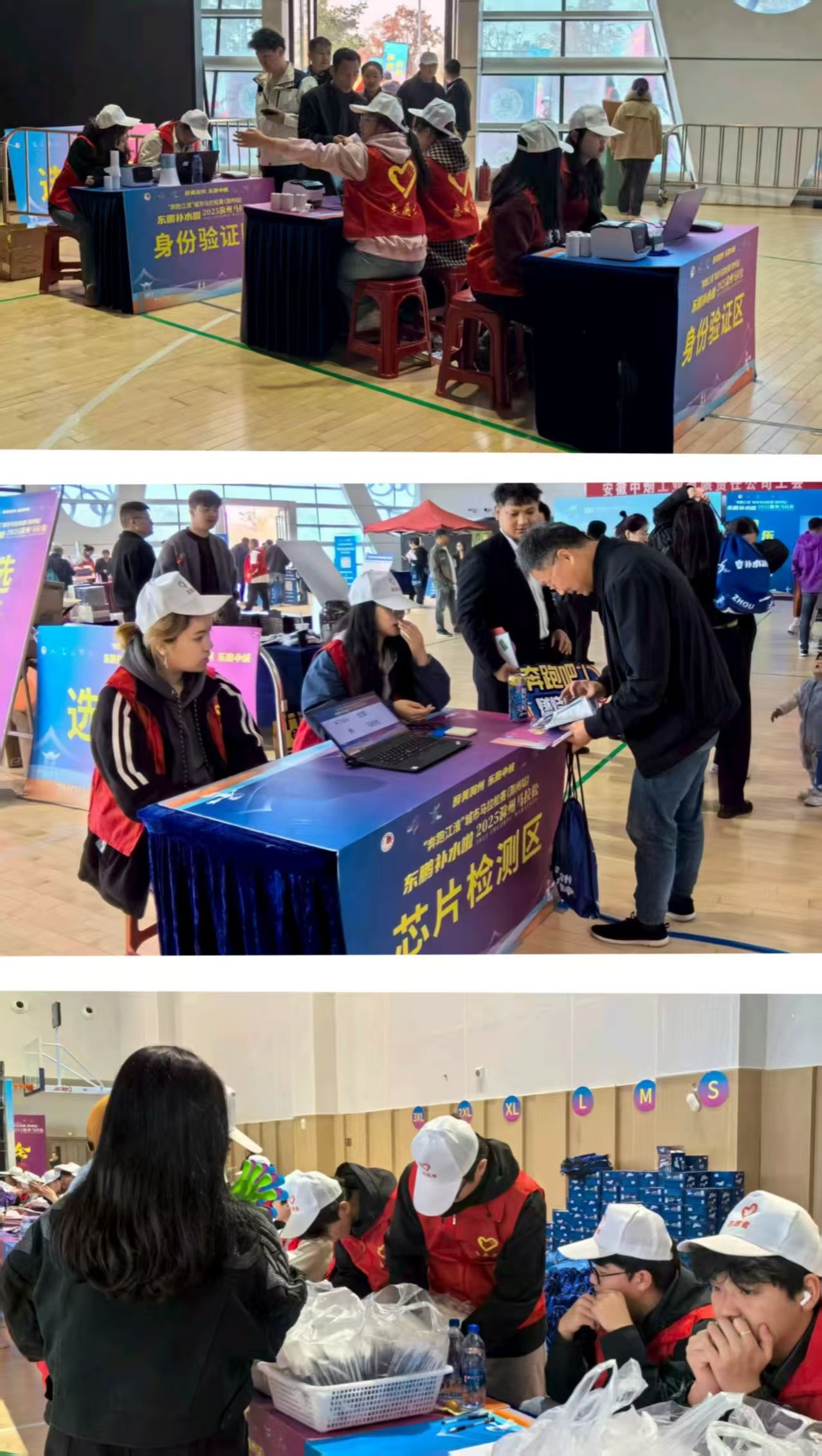 11月14日至15日,物资分发工作正式启动。志愿者们坚守各服务窗口,严格遵循“扫码签署免责声明—核验身份—打印小票—发放物资—芯片检测—保险确认”的规范流程,耐心引导参赛选手有序领物。针对15日领物高峰,志愿者提前优化动线设计,增设咨询岗位,及时解答选手关于尺码调整、物资核对等疑问,全力减少排队等候时间。对于需监护人陪同的未成年选手,志愿者们细致核验相关证件,确保物资发放合规有序。