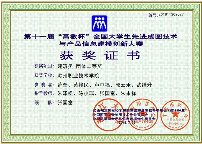 6月22日,由教育部高等学校工程图学课程教学指导委员会、中国图学学会制图技术专业委员会、中国图学学会产品信息建模专业委员会主办的第十一届“高教杯”全国大学生先进成图技术与产品信息建模创新大赛,在南京工业大学落下帷幕。土木系选手黄翰民、卢中福等7位同学在朱泽松、陈小瑞、张国富、朱永祥4等位老师的指导下,在总成绩位列129个建筑类代表队(106个本专科学校)第25名,喜获团队队二等奖,其中黄翰民同学在全部1105名参赛选手列73名,喜获个人二等奖。