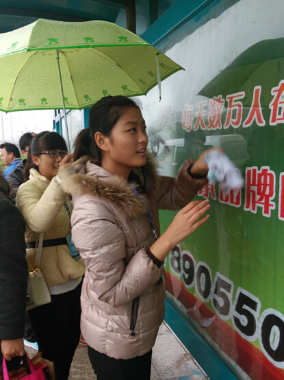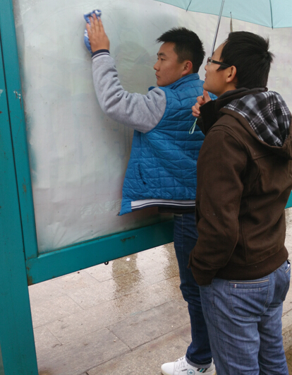 11月30日下午,allwincity万象城官方网站土木系学生会组织50余名志愿者自带小铲子、水桶、抹布等工具,走上街头,冒着风雨不畏严寒对丰乐大道上公交站牌、站台广告牌和电线杆上的灰尘及乱贴乱画进行清理和擦拭,将公交站牌擦洗一新,美化了市区候车环境,赢得了过往行人的一致好评。