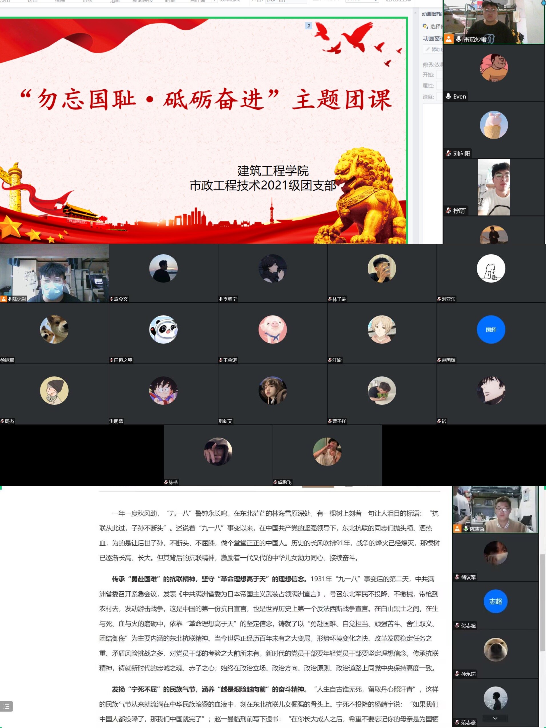 活动以线上观影和开展主题团课的形式进行。建筑工程学院学生会组织我院青年学子线上观看《勿忘九一八》视频,回顾“九一八”历史事件,帮助大家加深对历史的了解。当历史场景再现,所有的记忆与“九·一八”纪念碑一起,在每位青年心里留下深深的烙印;团总支组织各支部开展了《铭记历史,见证峥嵘岁月》《请党放心,强国有我》等党史微团课讲述,支部负责人向支部成员讲解“九一八”事变的由来和中国抗战胜利的意义,通过图文并茂的形式讲述抗战时期中国民众不屈的斗争以及涌现出的可歌可泣的鲜活故事,带领成员重温那段烽火岁月。