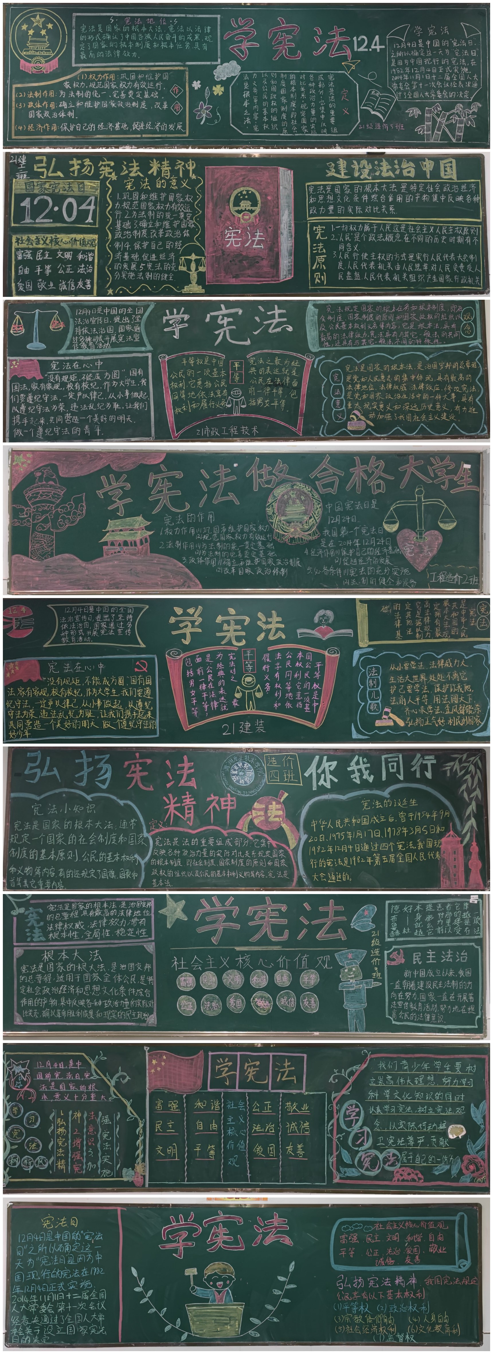 宪法是我国的根本大法。为弘扬宪法精神,维护宪法权威,进一步引导大学生树立社会主义法治理念和法治意识,养成遵纪守法的行为习惯,培养懂法、守法、用法的社会主义好公民。11月24日-28日,建筑工程学院学生会组织开展“学宪法 做合格大学生”黑板报展示活动。