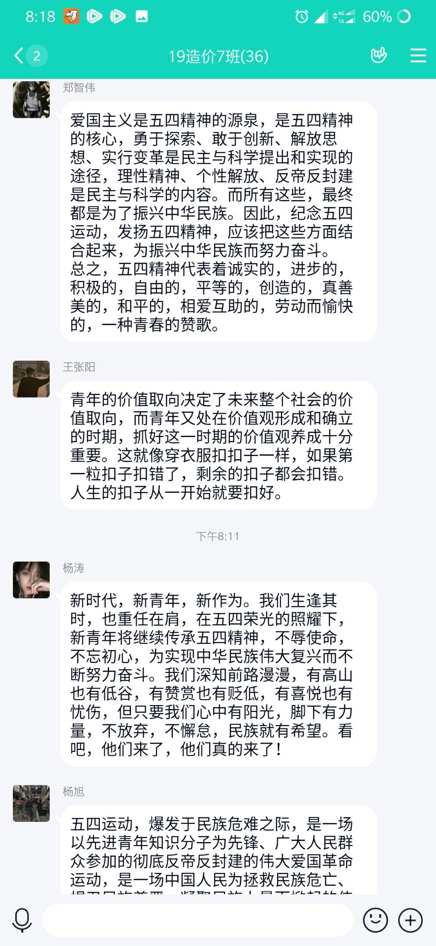 活动中,同学们认真学习了五四精神的相关内容,深刻领悟到五四精神的意义。通过对革命先驱者的敬仰和缅怀,大家深刻感受到美好生活的来之不易,同学们通过QQ群、朋友圈等线上平台将自身感悟表达出来,他们认为作为当代青年,应充分发挥主观能动性,增强责任感,荣誉感使命感。