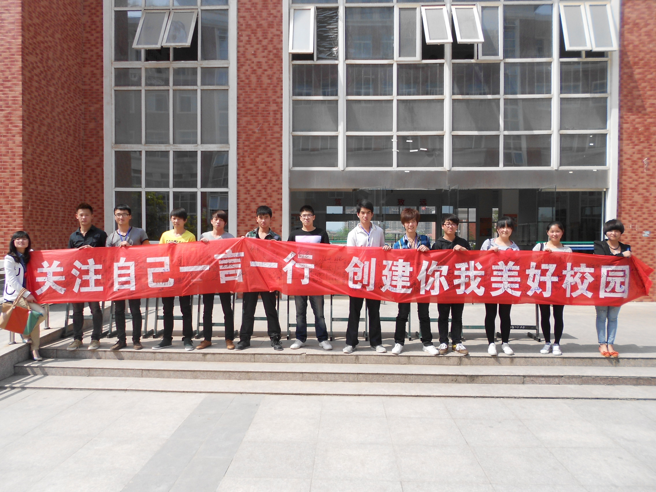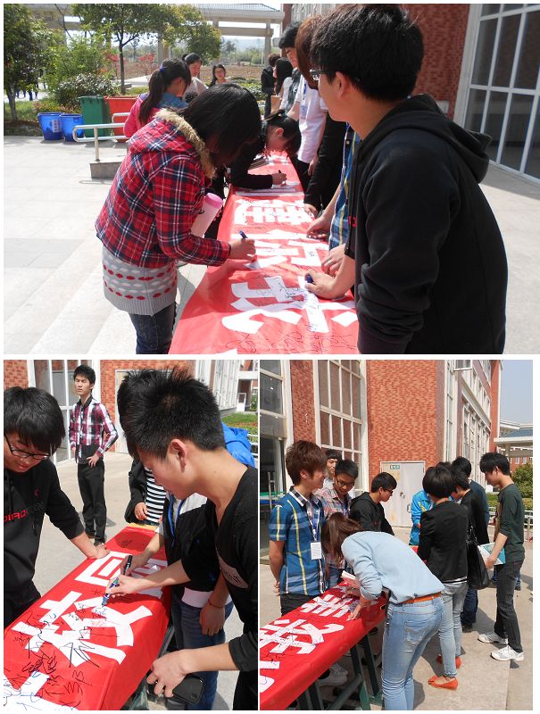2013年4月26日中午,在5号楼前,机电系开展了一场“校风与我”主题签名活动。参加本次活动的人员来自各部的学生会成员及各班的同学。