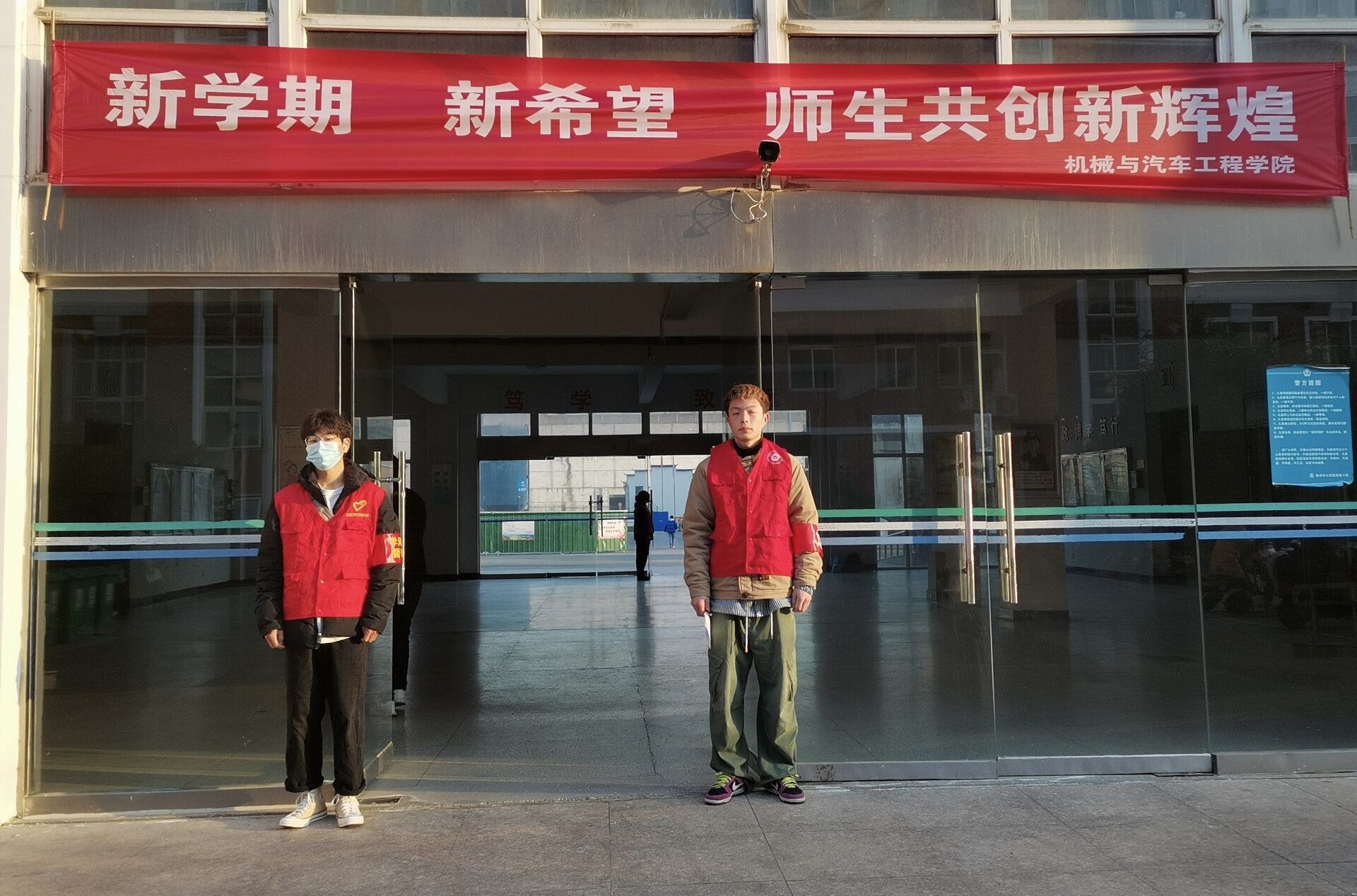 早课前,机械与汽车工程学院学生干事身穿红色马甲,于大厅门口监督学生不可以把早饭带进教室,并仔细纪录迟到学生信息。今天是开学第一天,也站好了第一班岗。