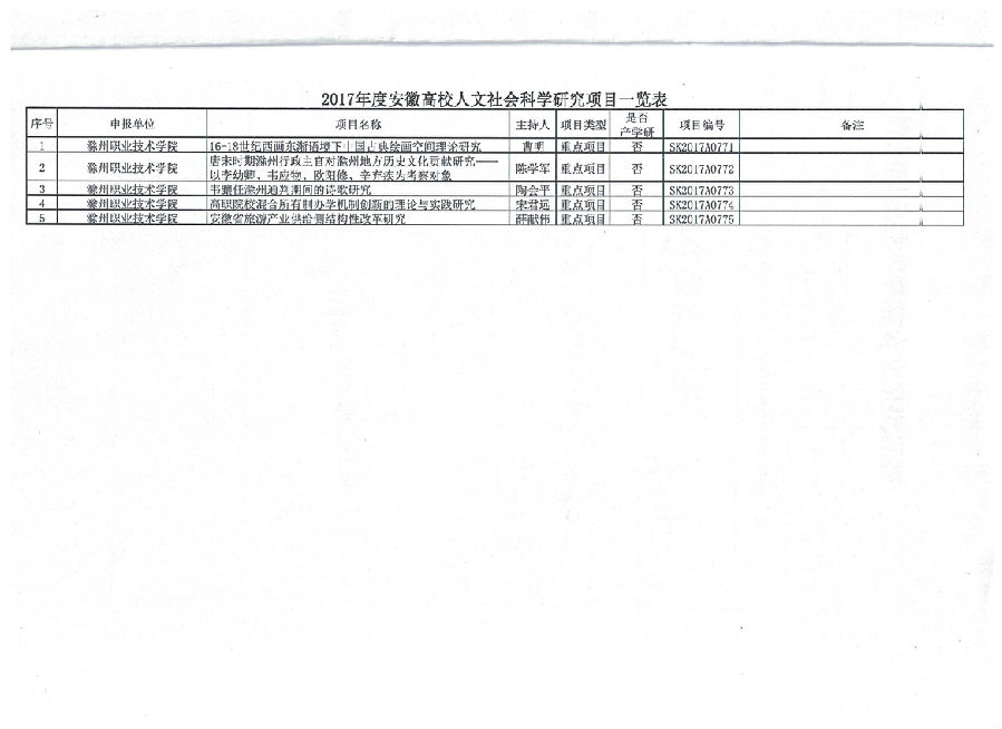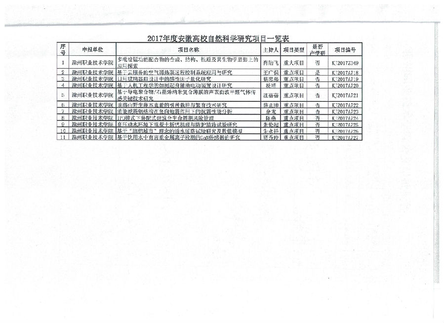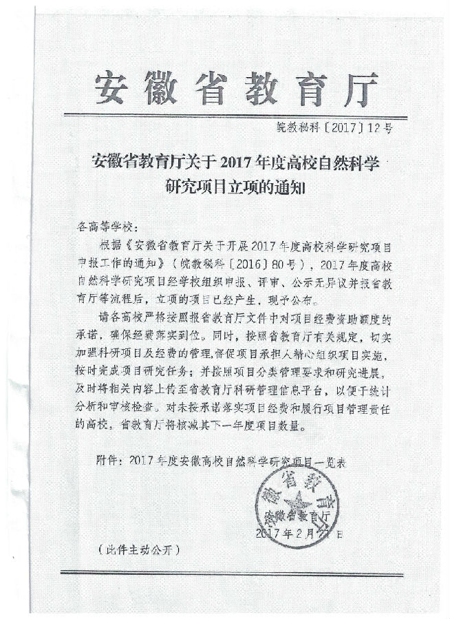 近日,接《省教育厅关于2017年度高校人文社会科学研究项目立项的通知》(皖教秘科【2017】11号)《省教育厅关于2017年度高校自然科学研究项目立项的通知》(皖教秘科【2017】12号)文件,我院有16名教师申报的项目获批立项,其中,人文社科5项(见附件1),自科11项(含1项重大项目,见附件2),请各系部通知到项目负责人。