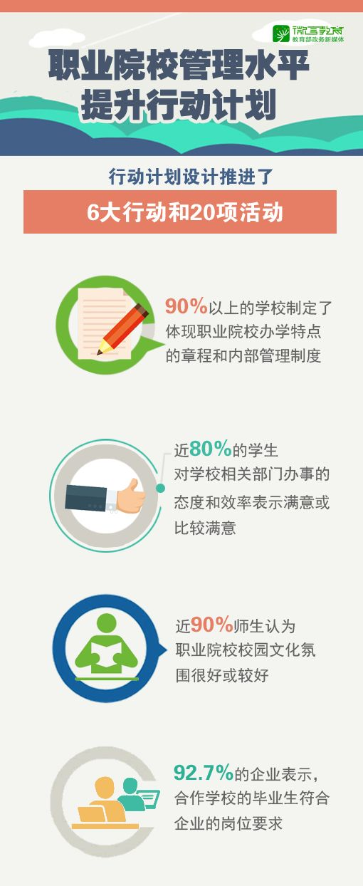为贯彻全国职业教育工作会议精神和《国务院关于加快发展现代职业教育的决定》,2015年教育部启动实施《高等职业教育创新发展行动计划(2015—2018年)》和《职业院校管理水平提升行动计划(2015—2018年)》。两个行动计划,在设计上一个重在以改革创新引领发展,一个重在以规范管理保障发展。如今,两个行动计划即将收官,到底有啥成效?必须要了解!