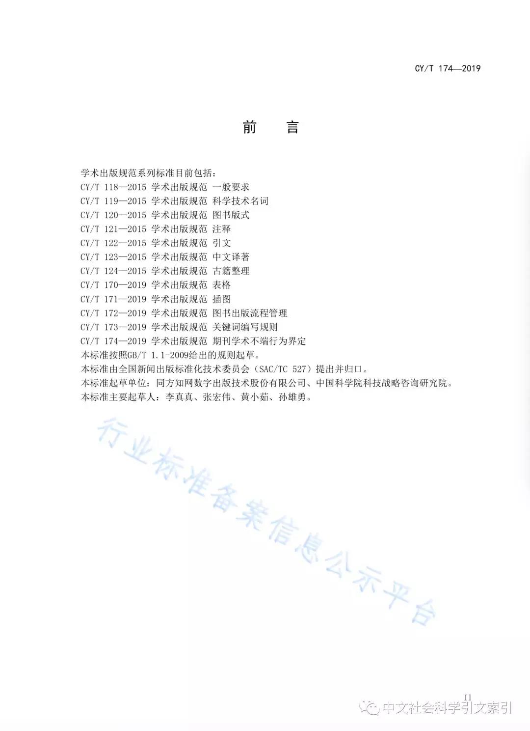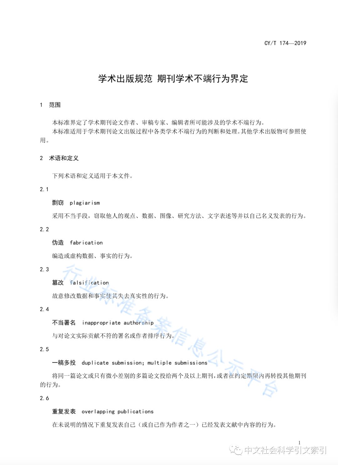 行业标准《学术出版规范——期刊学术不端行为界定(CY/T1742019)》由全国新闻出版标准化技术委员会归口上报,主管部门为国家新闻出版署。2019529日发布,201971日正式实施。
