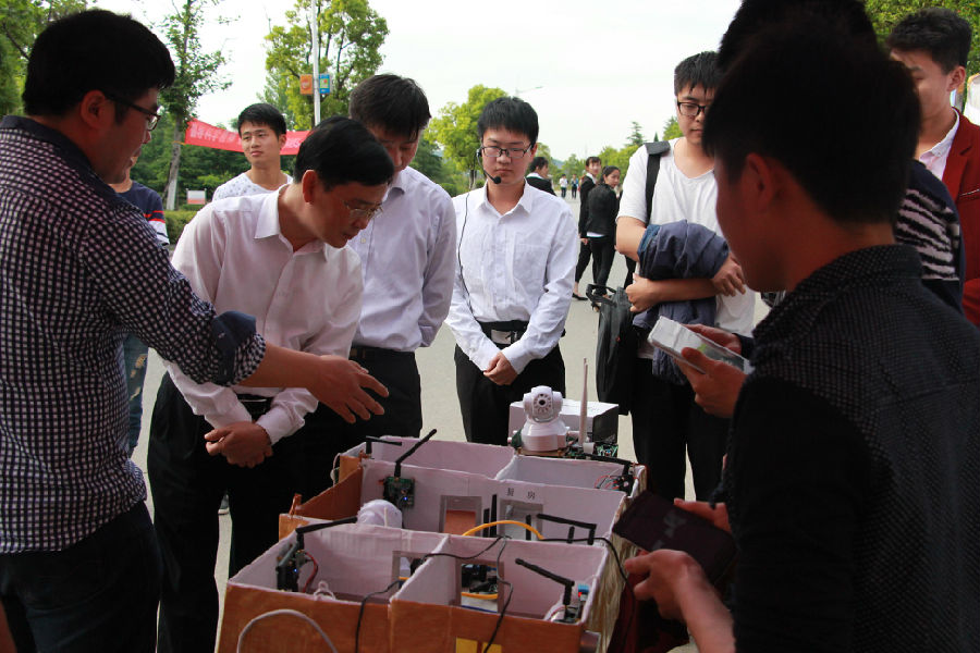 科普进校园主要有科普知识展和学院师生科技成果展两个方面。科普知识展内容丰富,有专利法知识简介、有食品安全、有公民健康常识、有生产安全常识和“化学与生活”主题等等专题。4月18日的科技成果展,展示了我院师生共同研发的科技作品,有信息系刘青老师带队研发的“舞蹈机器人”、“智能家居”、“智能小车”,有汽车系廖玉松老师带队研发的“一种机械传动演示台”发明专利产品。学院李柱梁院长、江洁副院长和汪上副院长也来到了展示现场。院领导们在观看了舞蹈机器人的表演后,对于产品的研发过程与留情老师做了交流,并对“机器人”“智能家居”等作品的改进做了建议,在肯定刘老师的成绩之后,鼓励刘老师敢于在国家级技能竞赛平台上一展技艺。