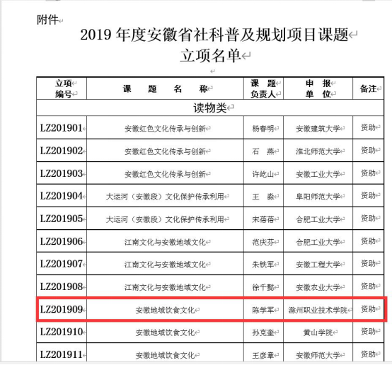 近日,根据安徽省社会科学界联合会下达的“2019年安徽省社科普及规划项目立项的通知”获悉,经公开申报、资格审查、专家评审、公示等环节,2019年安徽省社科普及规划项目共立项49项,其中读物类项目37项,工作研究(规划研究)类项目12项,万象城官网陈学军教授主持的《安徽地域饮食文化》(LZ201909)项目立项建设,获资助经费1.5万元。