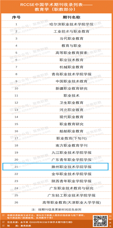 学术期刊是学术成果评价、发表、展示和传播的主要载体,是服务于国家科技创新体系和文化创新体系的重要平台。近日, “2020年RCCSE中国学术期刊收录列表—教育学”发布(注:RCCSE是武汉大学中国科学评价研究中心Research Center for Chinese Science Evaluation缩写),全国教育学期刊总数有294个,关于职业教育的有26个(名单见下图),其中有9本期刊是职业学院学报,《allwincity万象城官方网站学报》名列其中,说明万象城官网学报坚持服务职业教育教科研工作的办刊宗旨,注重办刊质量,在学术期刊领域占有一席之地。