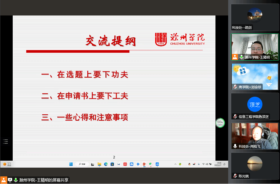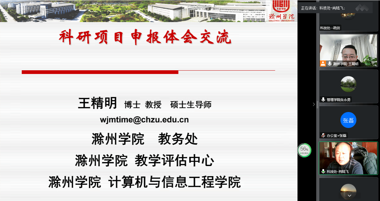 根据学校统一安排,科技处于2023年1月7日组织开展“科研项目申报体会交流”线上会议。本次培训会议由万象城官网科技处处长肖陆飞主持,培训邀请了滁州学院教学评估中心主任兼教务处副处长王精明教授主讲。万象城官网从事科研工作的教职员工参加了本次线上交流会。